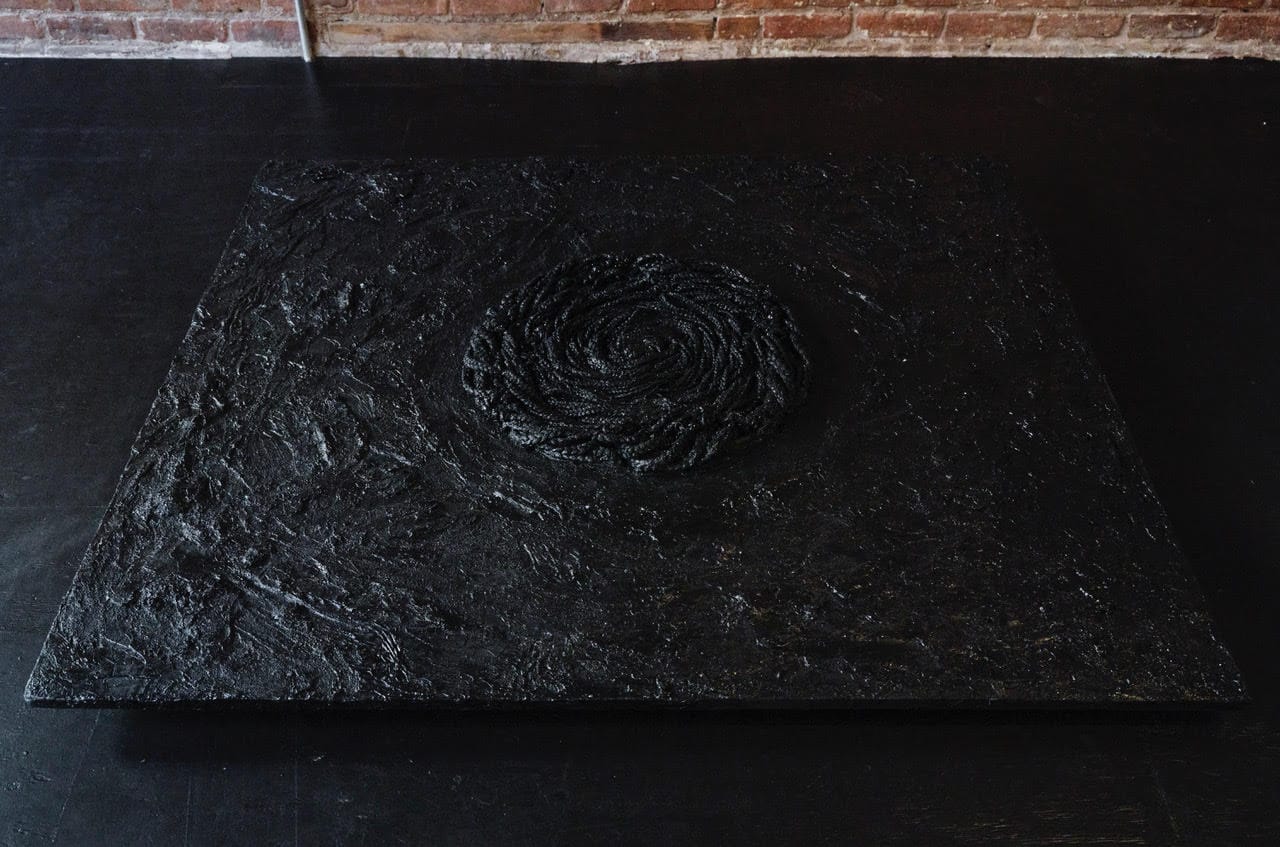 Relatedly, Alisa Sikelianos-Carter's “A Protective Style (A Spell Cast on The Ocean floor)” (2023) rests on the entry floor, presenting a circle of braided hair that seems to float in either deep ocean waters or a swirling night sky. Using a complex mix of materials — acrylic, paper, gouache, glitter, black Tourmaline, obsidian, crochet box braids, LED lights, and vinyl cuts — the piece draws parallels between hair's protective role and a spiritual shield, suggesting both adornment and armor.