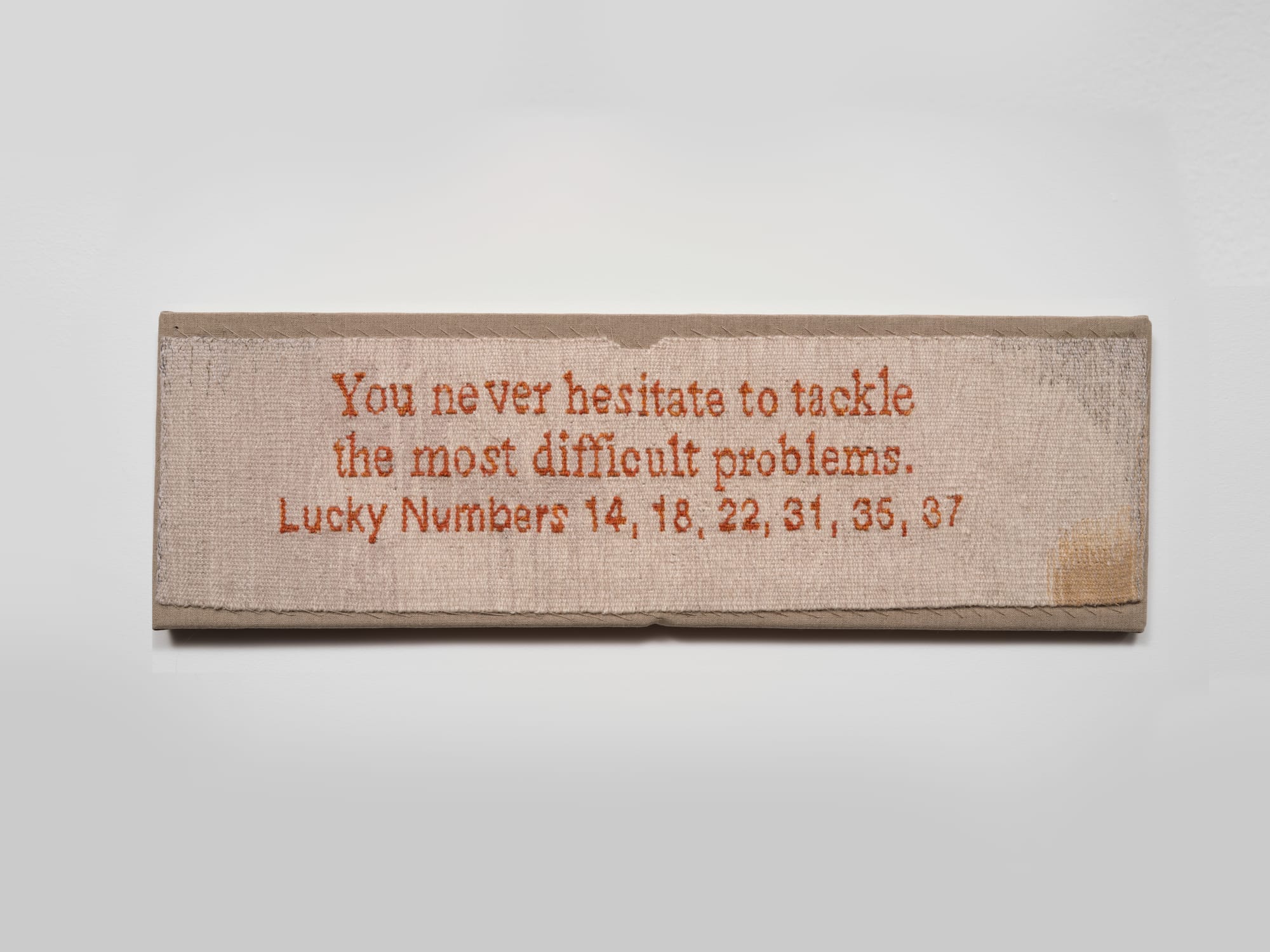 The opening salvo of Sin Fatigue, Nadine Sarriedine gallery’s inaugural show, is a fortune cookie message rendered in textile by Erin M. Riley: “You never hesitate to tackle the most difficult problems,” along with a selection of lucky numbers. The message serves as an apt mission statement for a gallery trying to carve out its digital and physical footprint in the downtown art scene, as well as this show in particular, which explores the creation and performance of selfhood across the motley work of 13 artists. (“13,” curiously, is not one of Riley’s lucky numbers.)