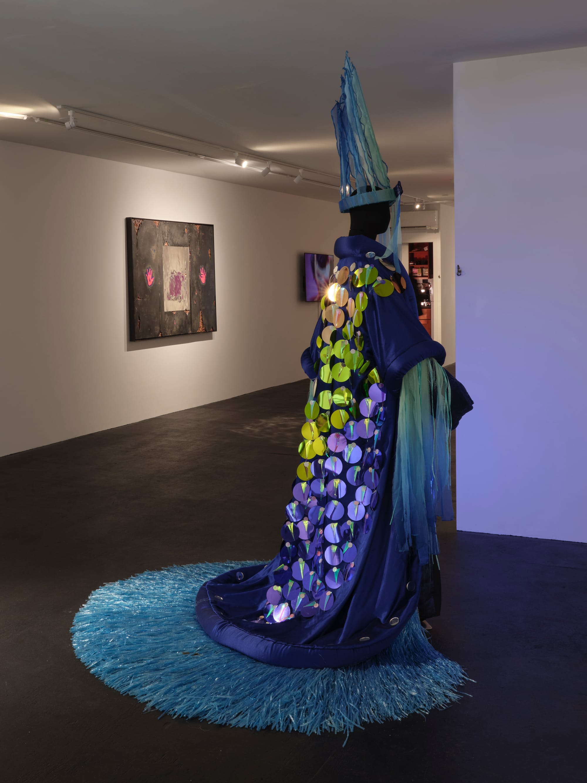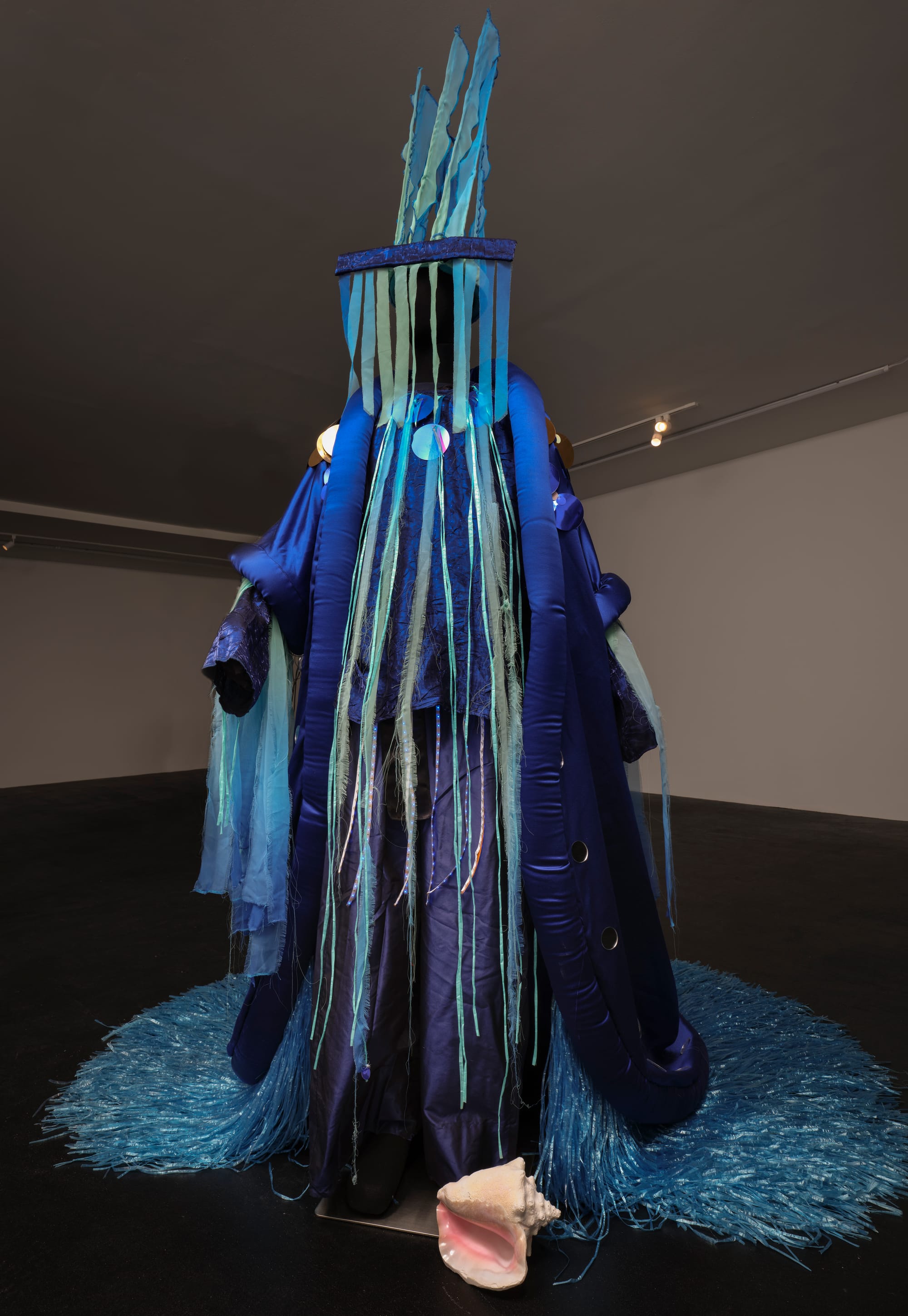 Laura Anderson Barbata's “King Olokun, (Intervention: Ocean Blues)” (2018), meanwhile, translates the power of a sea deity into what recalls a drag performance costume. Named for the Yoruba ruler of the sea, the ensemble gleams like bioluminescent ocean life: A crown of blue fronds rises like seaweed toward the sky, topped by a fringed blue lampshade-like headpiece, while a blue satin cape sparkles with iridescent circular and talon-shaped sequins and balloon string fringe. Just as bioluminescence illuminates the ocean's hidden depths, the costume spotlights the growing crisis of climate change much like a drag performance might satirize social issues.