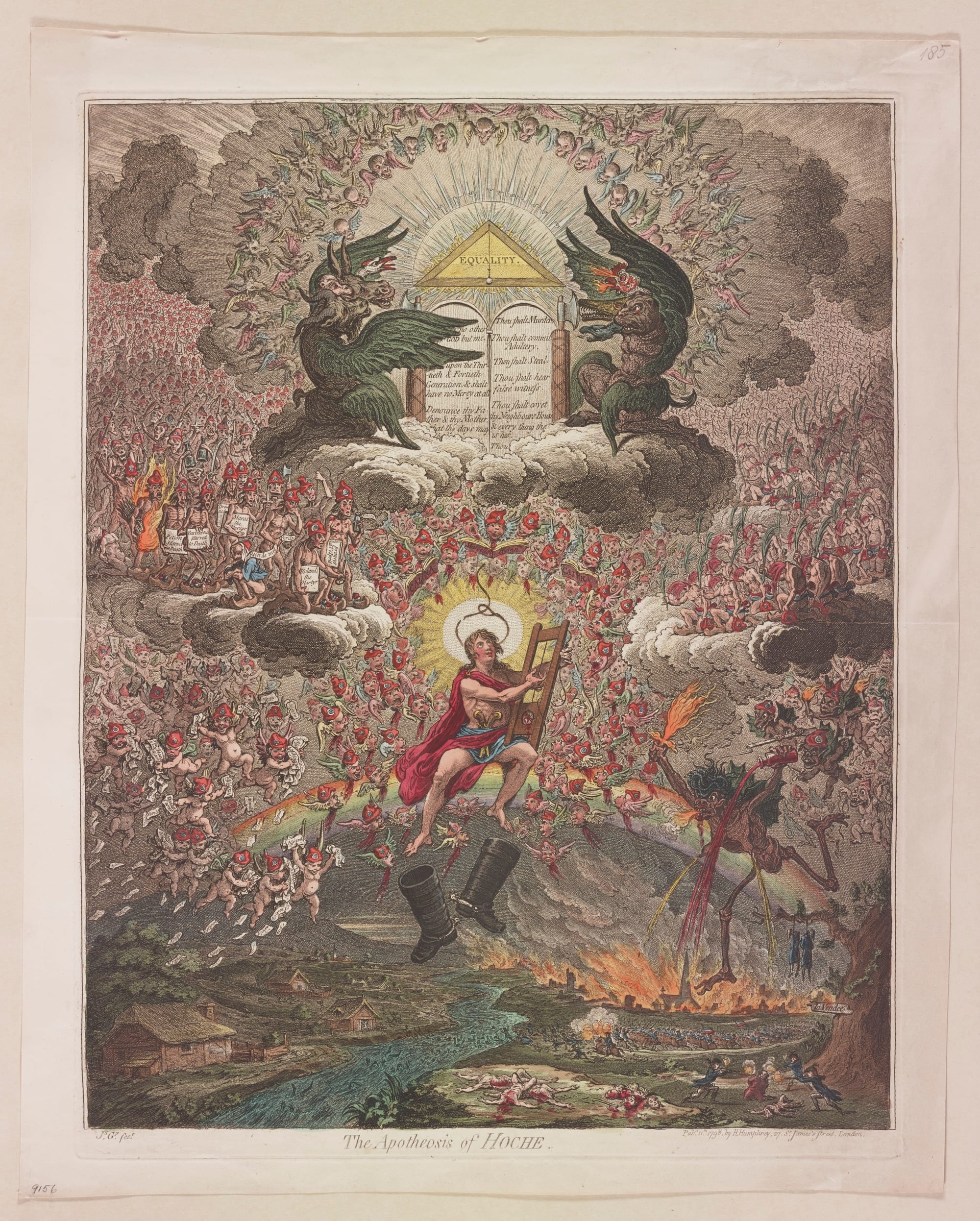 So while prints such as James Barry’s “The Phoenix, or the Resurrection of Freedom” (1776) use the staid visual language of neoclassical history painting to denounce “the tyranny of monarchy, heredity and privilege,” the exuberant polemic of a satirical work like James Gillray’s “The Apotheosis of Hoche” (1798) is fabulously unhinged. And while William Blake was famously eccentric, it’s amusing to read an account of John Hamilton Mortimer that describes him as a “fop, a rake, a bon-vivant, a reveller, an indiscreet, dissipated young man.” I mean, what’s not to like?