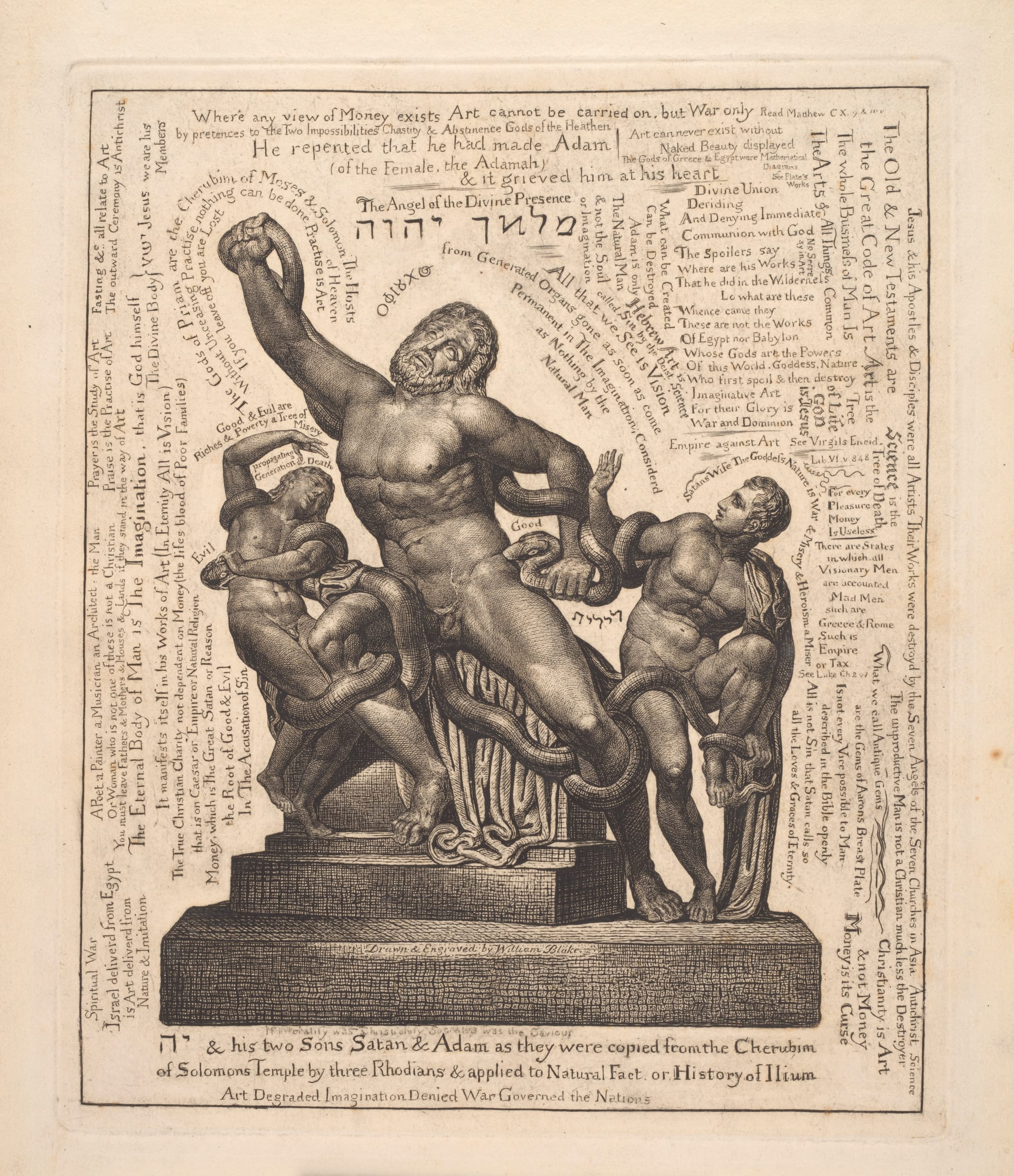 With a lot of art historical detail and an academic focus, Chadwick’s book might seem an unlikely fit for the general reader — but because it concerns prints often intended for broad audiences, it has inherent accessibility. As much for artists as for scholars, The Radical Print might prove useful as both source material and inspiration. Take the example of William Blake, who Chadwick writes was “explicit about the prophetic role of the artist in his illuminated books.” In service of that role, Blake invented his own printmaking method, relief etching, which allowed him to integrate image and text on the same plate, a technique he used with gusto. While his illustrated poems are familiar, his annotated engraving of the classical statue of Laocoön and his sons is a revelation: “Echoing at a formal level the traditional engraver’s action of rotating the plate on a leather pad to manipulate the direction of the burin’s strokes, Blake surrounded the central image on all sides with a profusion of fragmentary and non-linear texts that condense his lifelong critique of commerce, empire and war.”