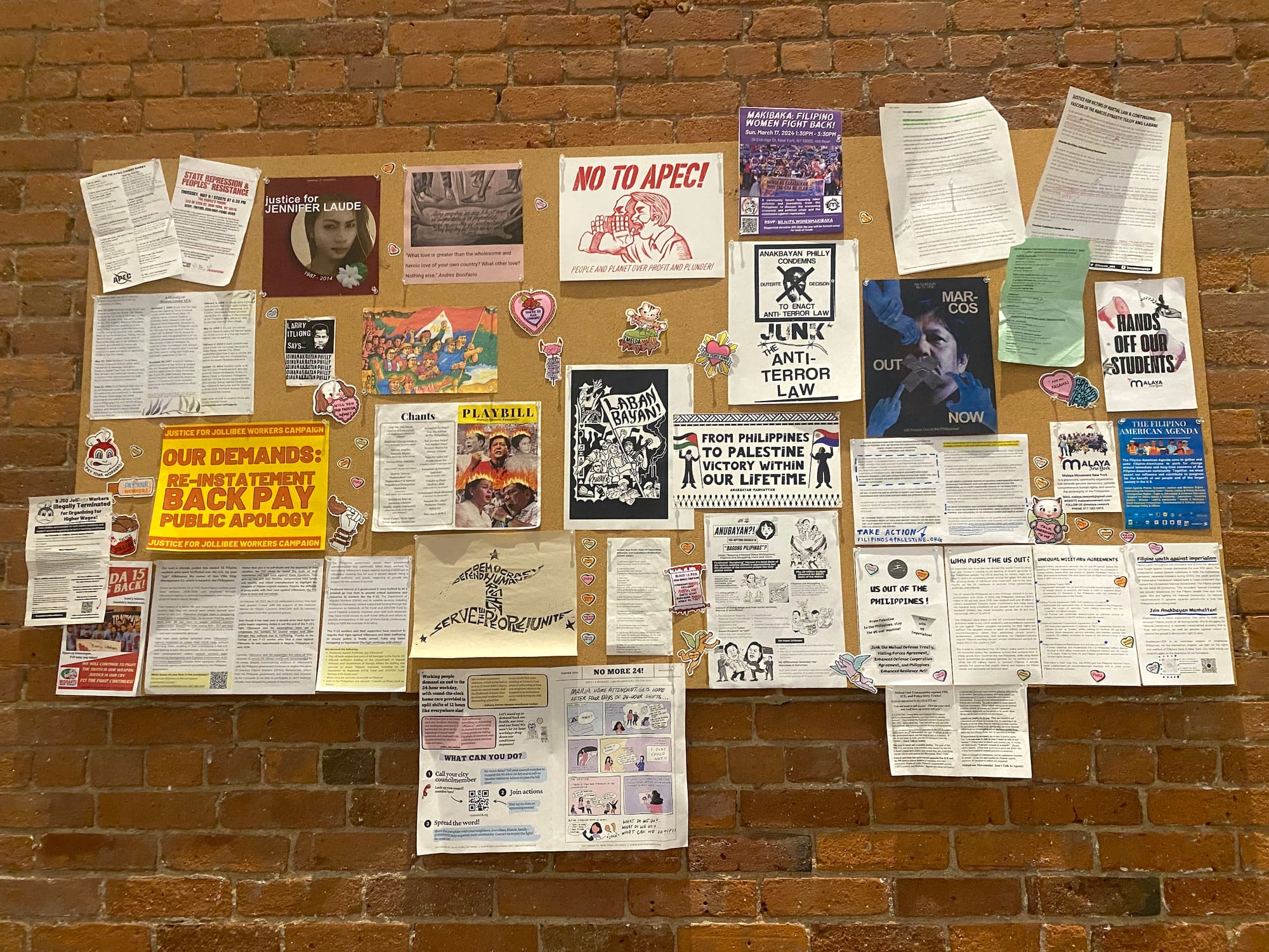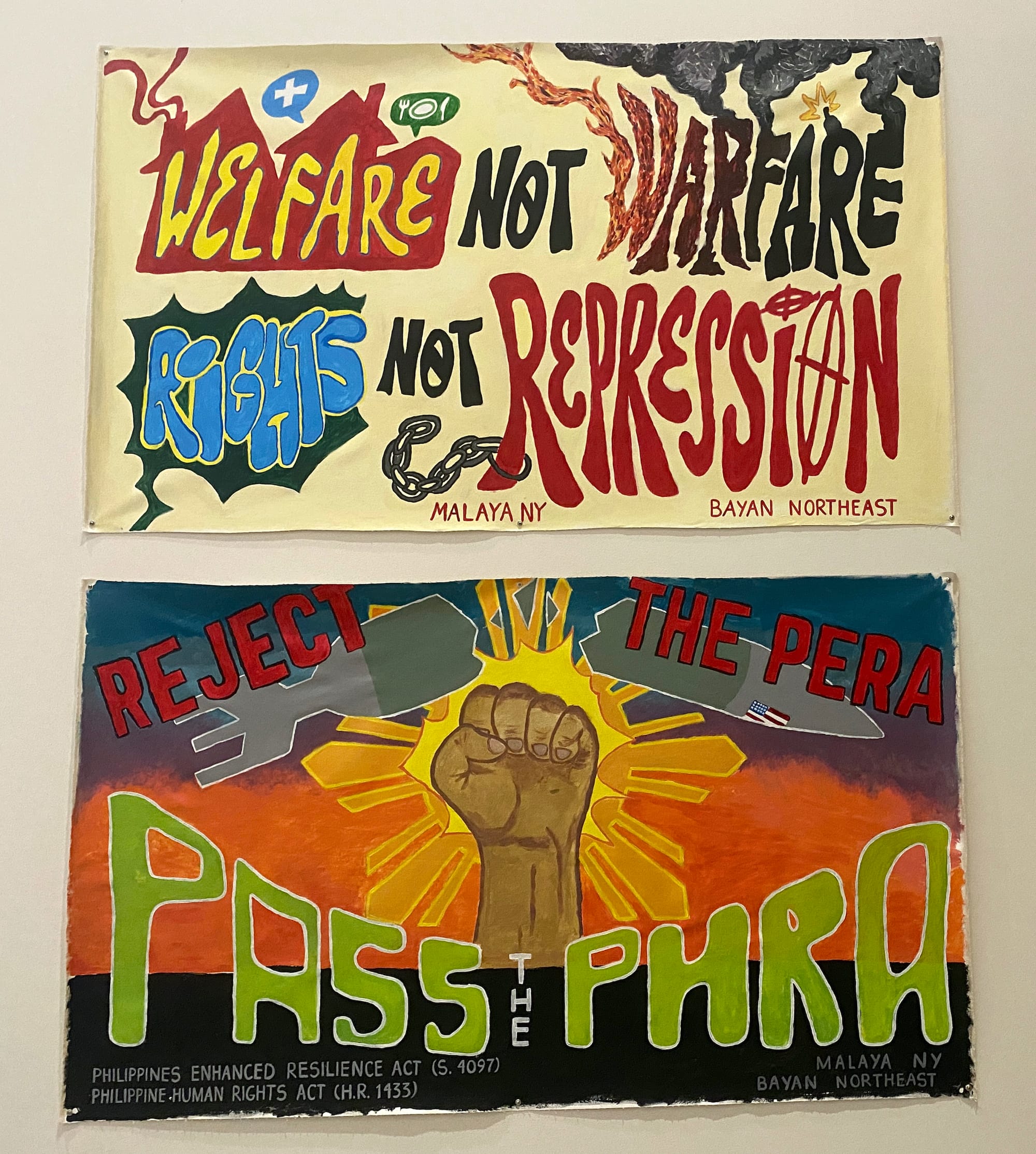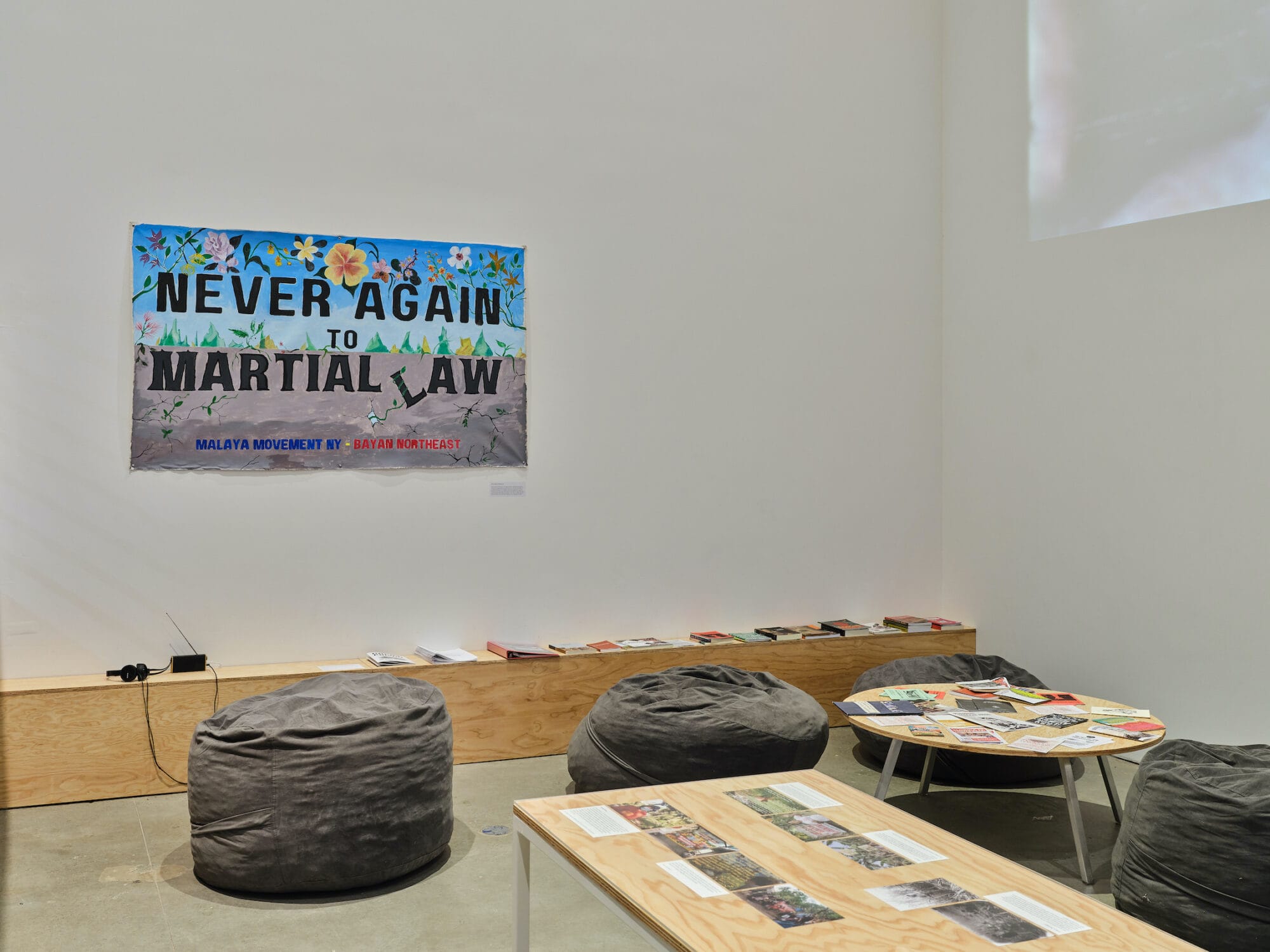 Accompanying the show is an installation made with materials from a number of activist organizations in the Philippines, including two in New York, that work toward the national democratic mass movement, which challenges social inequality through an alliance of workers’ unions, peasant associations, and cultural workers. Photos, music videos and posters adorn the gallery alongside “Daluyong,” a 1984 documentary by Joey Clemente and Nil Buan Jr. about the Lakbayan, or Lakad ng Bayan para sa Kalayaan (People’s March for Freedom), a movement against Marcos.