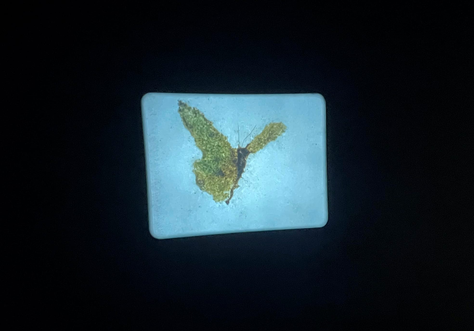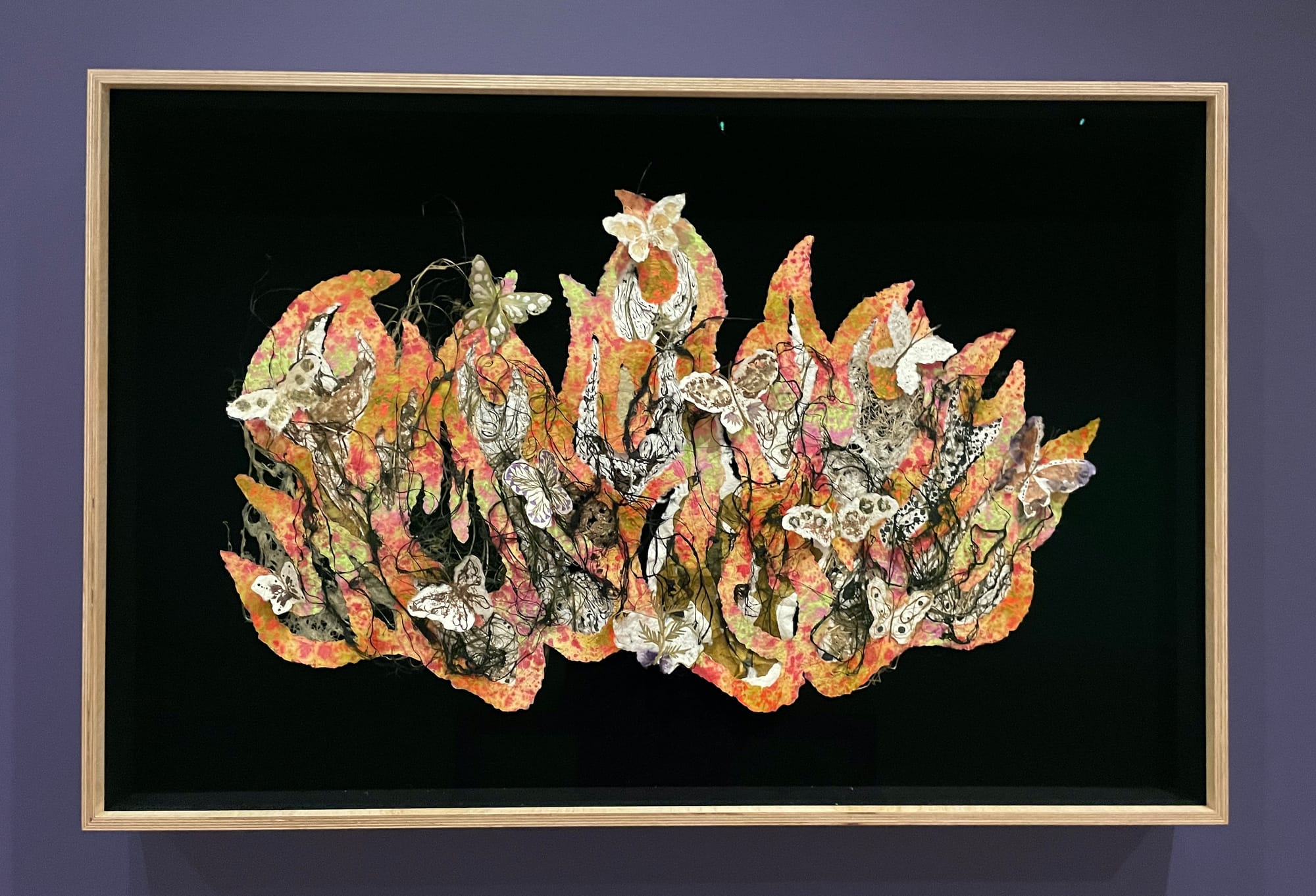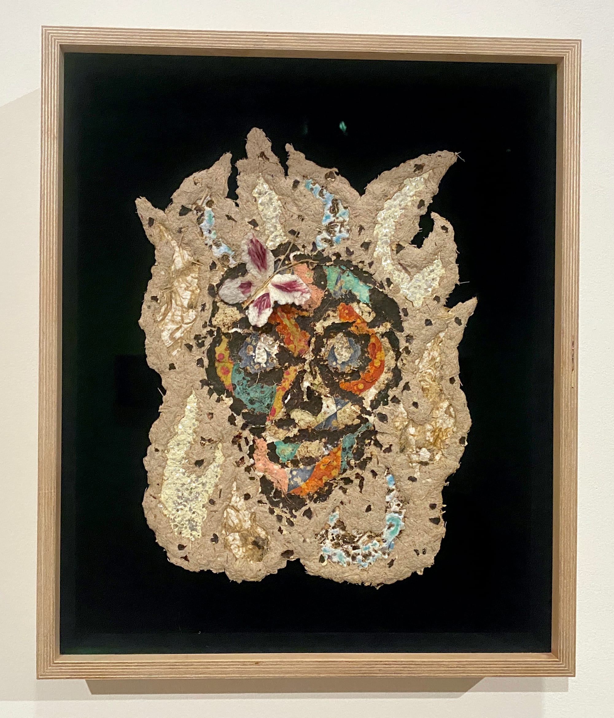 Thus, the offerings in Offerings for Escalante include the earth itself. “Social Volcano (restless waves)” (2024) is a watercolor work mixed with elements like beeswax, banana stalk, lemongrass, and coconut husk. It depicts Mount Kanlaon, the third most active volcano in the Philippines and the origin of life in local mythology, as a living and breathing entity merging with the clouds and vegetation. In “Tiempo Muerto” (2022), the artists portrays a butterfly atop a skull, using materials such as tea leaves, mica, and joss paper. The work’s title, meaning “dead time,” refers to the months of downtime in sugarcane farming, when farmers have no income or work due to monocultural farming’s impact on local flora.