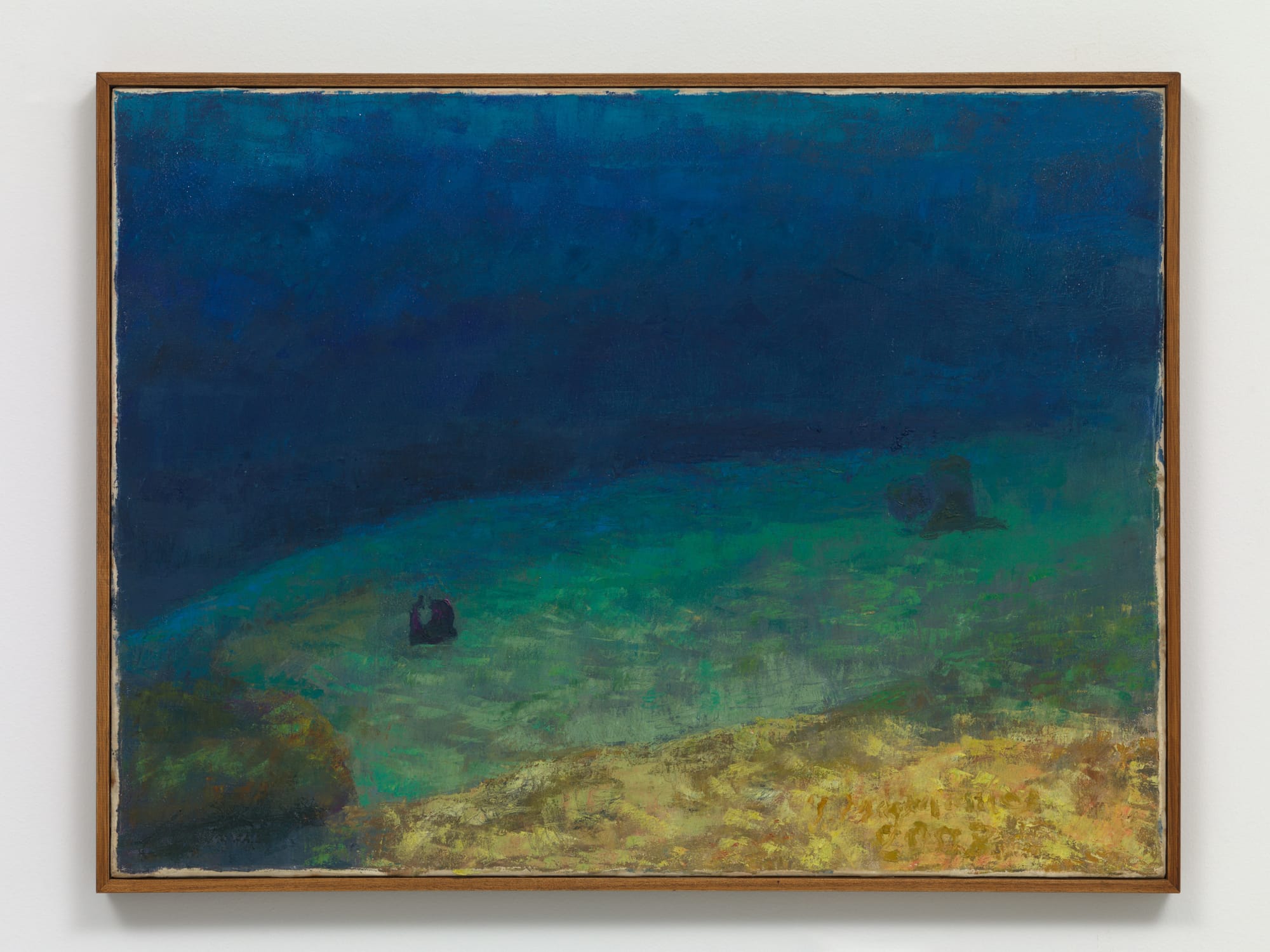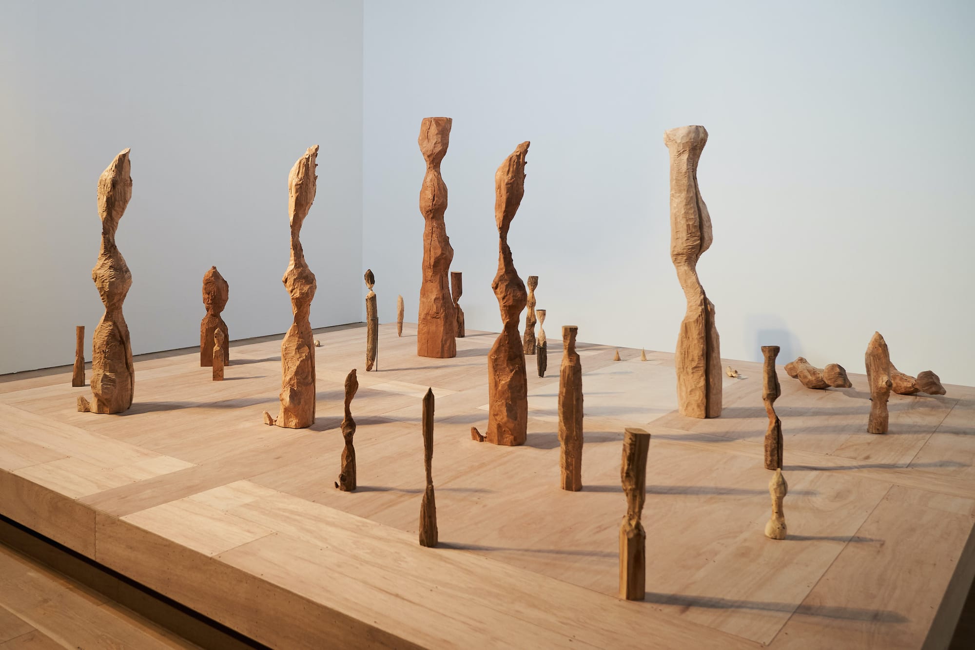 Nearby, two groupings of artworks look back to the early days of conceptual nature-artist interactions, starting with Turin-based Giuseppe Penone, who in the 1960s famously placed a bronze cast of his own hand into an ash tree; over the years, the tree grew around the intervention, which he titled “Continuerà a crescere tranne che in quel punto” or “It Will Continue to Grow Except at That Point” (1968–2003). In this show we see a similar piece with a walnut tree. Seminal land artist Agnes Denes also makes an appearance, with photographs of trees chained together (part of the “Rice/Tree/Burial” project she executed for decades, beginning in the 1970s) as well as documentation of her classic reforestation project “Tree Mountain: A Living Capsule,” started in 1982. For this work, 11,000 individuals each planted a tree in a spiral formation on a manmade mountain in Finland.