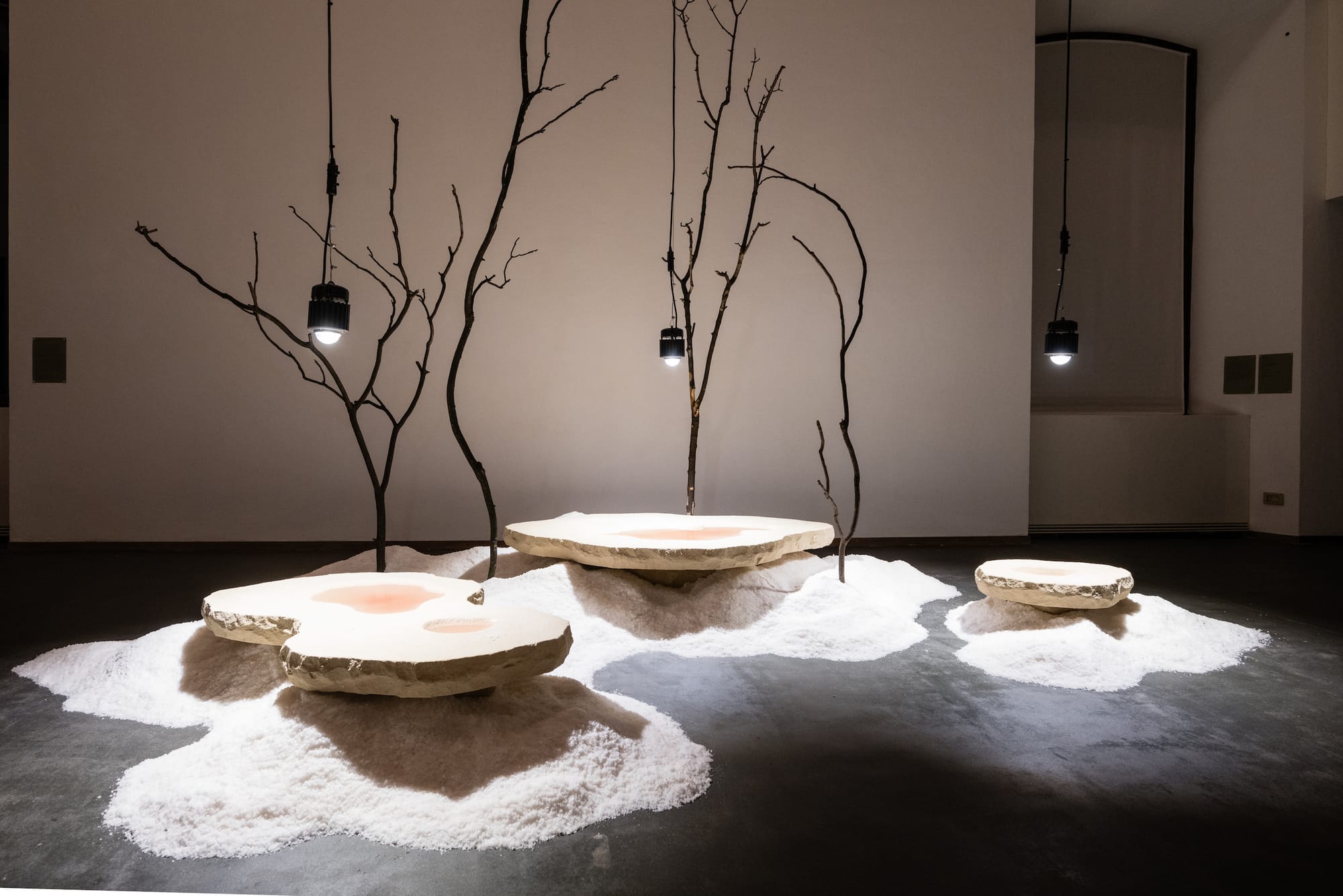 Retracing my steps, I was struck by the optimism inherent in art emerging from interspecies collaborations, some of which will continue to evolve, metabolize, or decay over the course of the show’s run, perhaps making a few of these pieces a new form of time-based art. But as intriguing as the show’s premises are, the many works don’t add up to a particularly cohesive whole — although it’s unclear whether that was ever the point. Those of us who frequent mega-exhibitions have seen some of these artworks before, by Okomoyon, Saraceno, and others. And are they really collaborations? The majority of this art is still based on human manipulations of or interventions into natural processes — some of the “aid” here feels, to put it into political terms, far less reciprocal than nonconsensual. I was reminded of the work of Hong Kong-based artist Zheng Bo that was exhibited at Gropius Bau in Berlin a few years back. In one of the discursive events attached to his 2020 residency there, a question arose on the recent art-institutional focus on the “more-than-human”: “Why do we think a human cultural institution should cater to nonhuman species? Maybe they would tell us they don’t care, or maybe the earth would say ‘get this building off me.’”
