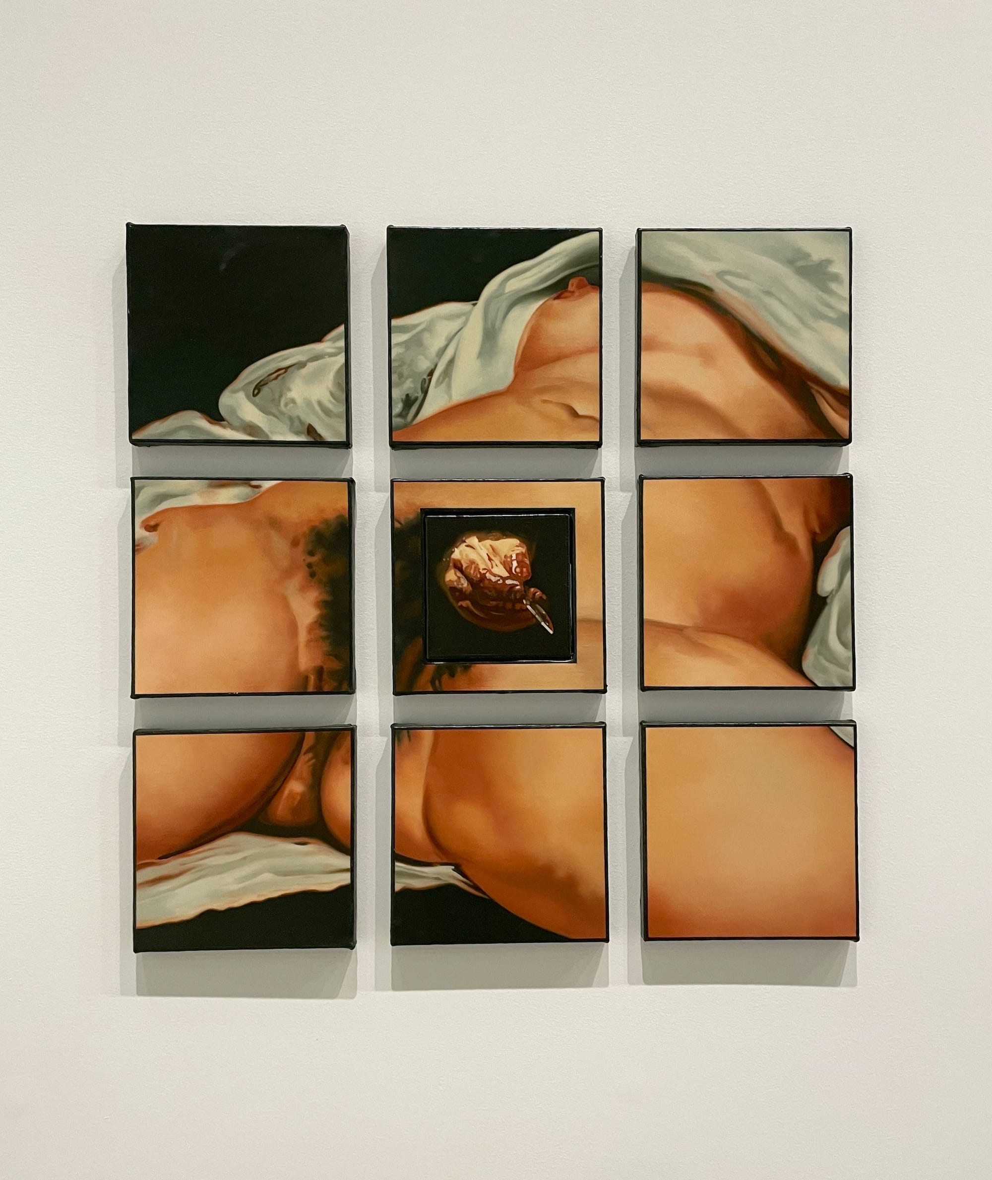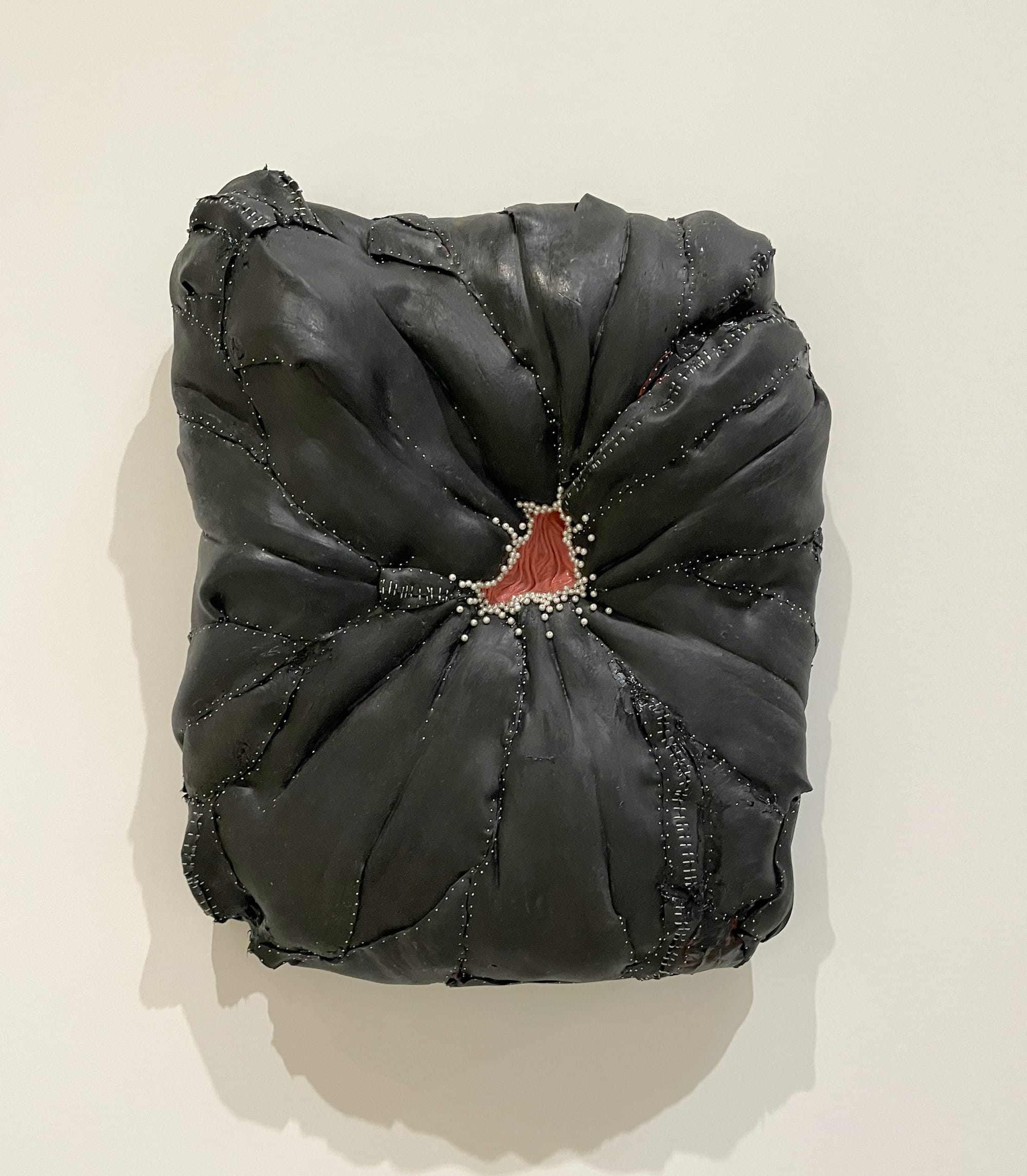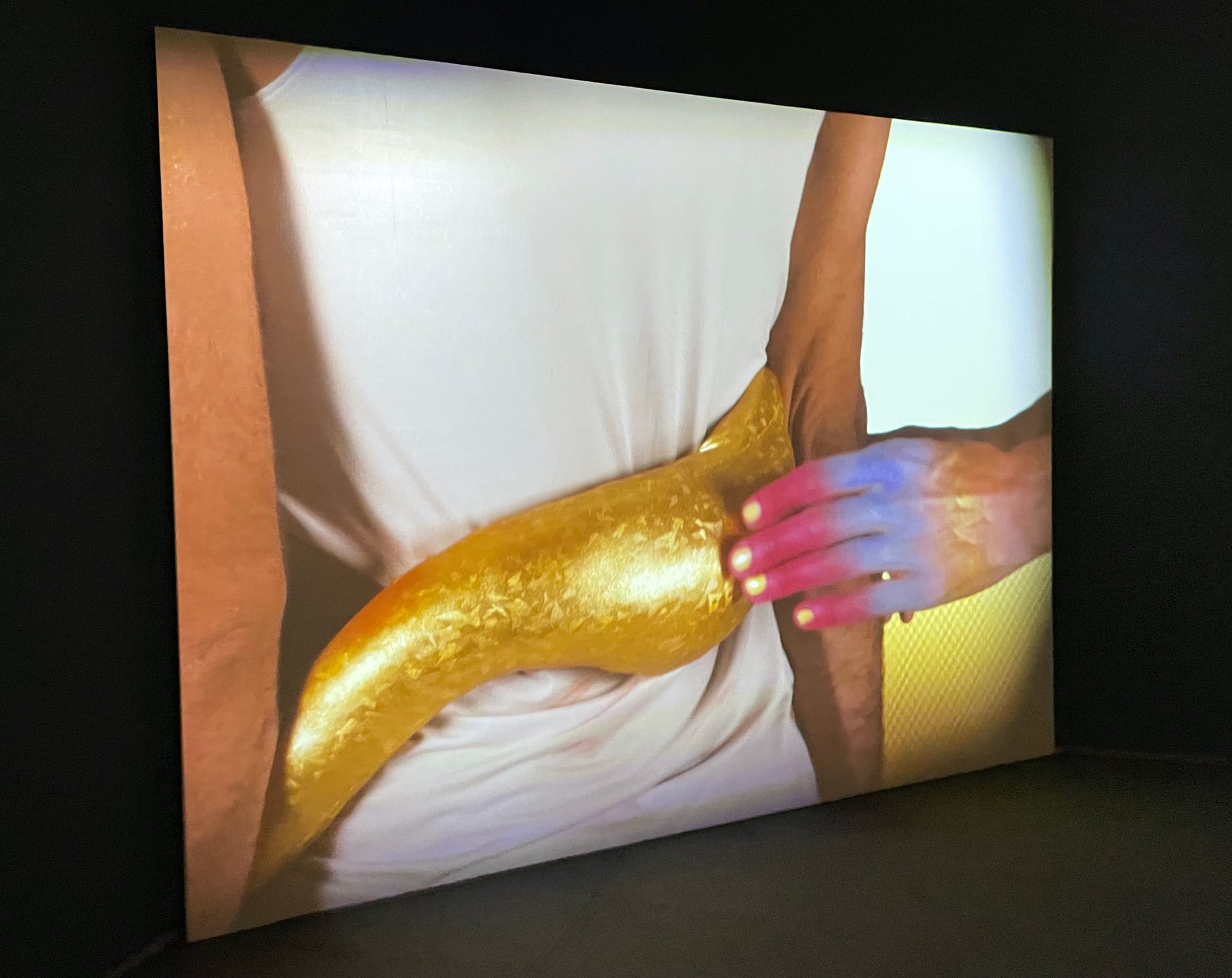Body horror is a subtle thread throughout, slipping and sliding into themes of womanhood and motherhood in ways that can border on instrumentalizing, particularly because the concept is generally feminine-coded and concomitant with abjection. An abundance of body horror imagery in popular culture and art that aims to reclaim the unruliness of the femme and maternal body risks reinforcing that body as sociopolitically abject — woman as marginalized other, as hysterical, as an excess to be contained by patriarchal law. Celebrating the unruly body is one thing; refusing its second-class social status in an actionable way is trickier. Body horror’s power lies in its ability to unravel subjects and systems that seem to be coherent entities. Candice Lin’s understated scent work, “The Smell of Abortion” (2024), hints at that potential by infusing the air with an invisible, disquieting presence. “Night Moon” (2024) — a ceramic sculpture with an enwombed video, also by Lin — is beautifully, seductively visceral even as it unsettles.