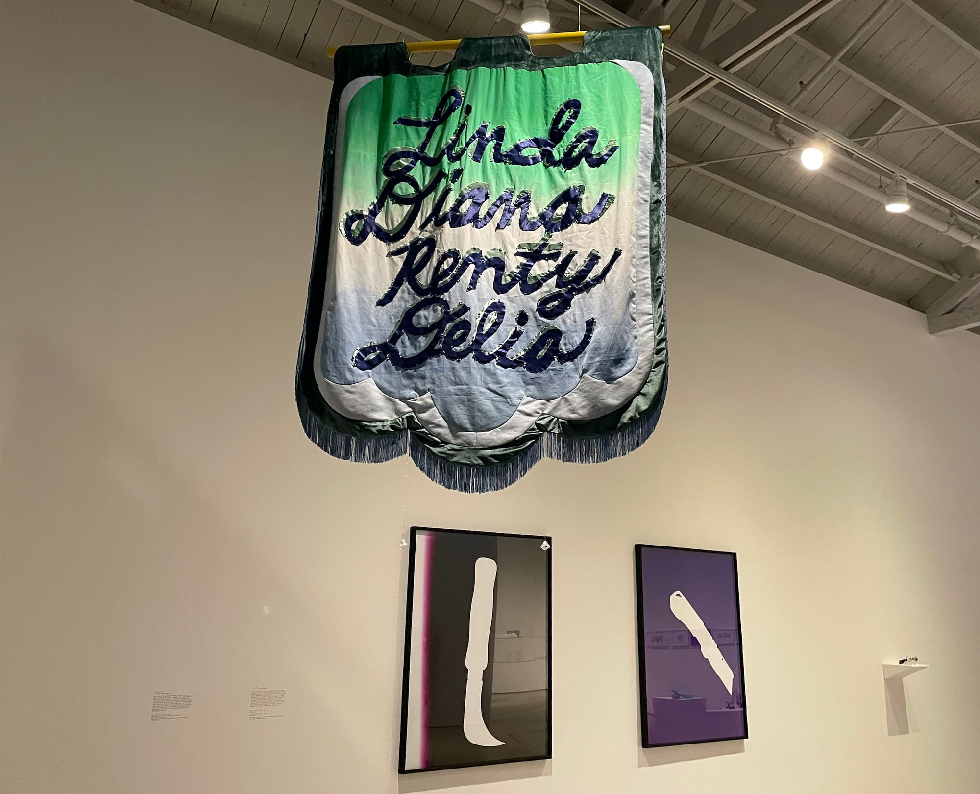 Joseph Liatela’s “On Being an Idea (the right to live without permission)” (2020) consists of textbooks related to the DSM-IV-TR, a manual created by the American Psychiatric Association to classify mental disorders, bound by shibari rope and set on a floating platform with LED lights underneath. It’s a smart idea, but its layered symbolism felt a little abstruse and didactic, similar to a scholarly text. “Arch of Hysteria” (1993), a nearby bronze Louise Bourgeois sculpture of a slender, ambiguously gendered body hanging from the ceiling in a supine arc, may be the most visually arresting work on view. Headless, it announces its abuse, but its specifics remain a mystery. Meanwhile, its glistening beauty threatens to eclipse the horrors it suggests.