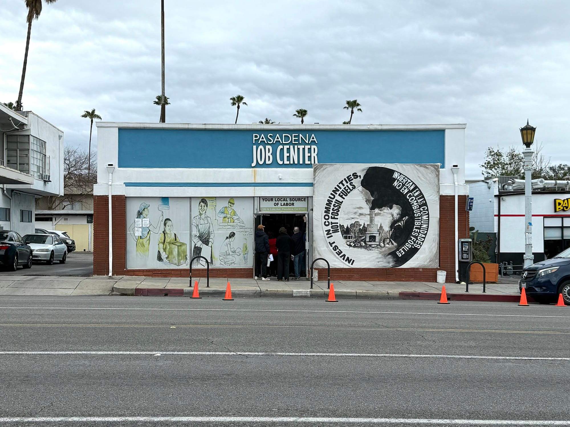 A depiction of Aparicio’s chimney belching thick, black smoke is the focal point of a new painting unveiled Tuesday, March 11, at a Pasadena rally targeting the fossil fuel industry for its role in the recent Los Angeles wildfires. The artist’s first work since the fires, it features a central image surrounded by the text “Invest in Communities, Not Fossil Fuels” in English and Spanish, a message echoed by the coalition of labor, community, and environmental activists who gathered at the Pasadena Community Job Center.