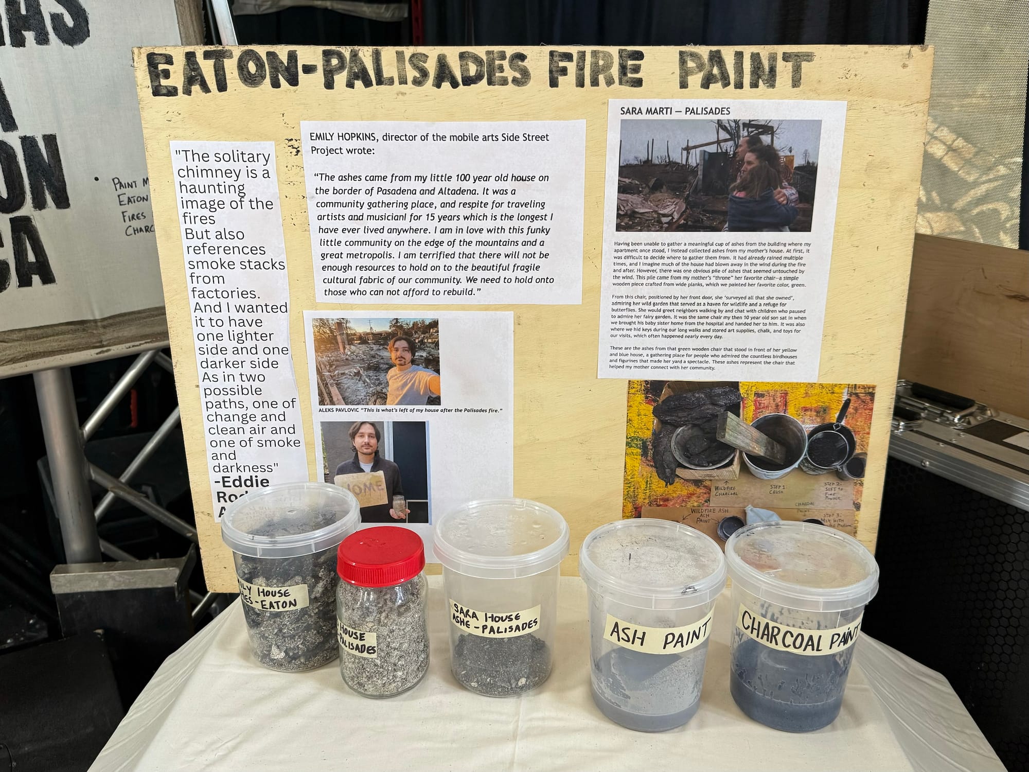 A group of about two dozen volunteers collaborated on the black-and-white painting, using pigments made from ash and charcoal collected at Altadena burn sites. The paint was mixed by Bay Area artist and activist David Solnit, who has used this method to create similar artworks using ash from the 2017 Tubbs Fire and the 2018 Camp Fire in Paradise — the deadliest and most destructive wildfire in California history. He told Hyperallergic that most of the burned material is collected from rural areas to avoid toxic chemicals, but he symbolically incorporates smaller amounts of ash donated from people’s homes before mixing it with an acrylic binder.