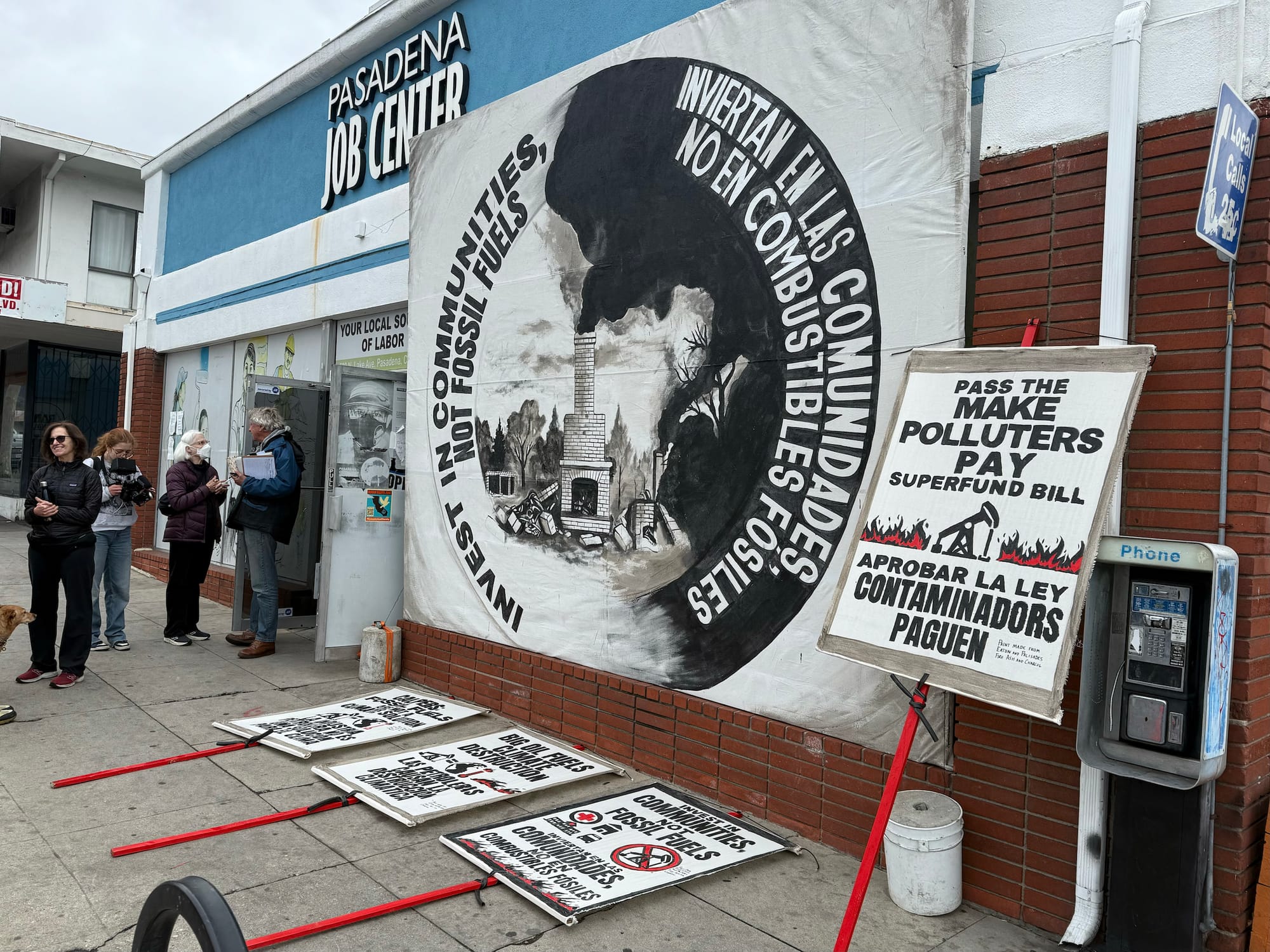 At the Pasadena rally, several signs, also painted with fire ash pigment, demanded that lawmakers “Pass the Make Polluters Pay Superfund Bill.” The recently proposed legislation “would impose an annual assessment of $50 billion on certain companies in the fossil fuel industry as partial compensation for the multitude of costs” resulting from emissions.