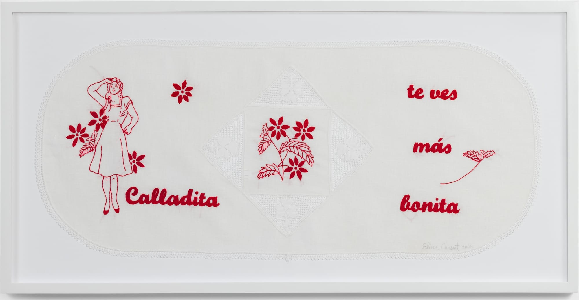 In a new body of work on view this week, Chauvet stitches a line between delicacy and brutality, approaching the seeds of spousal abuse and subjugation that germinate into violence and often murder. The embroidery series, titled Heridas Domesticas (2023–), pierces dainty white doily place settings with blood-red threads spelling out insults in Spanish: “estúpida" ("stupid"), “tonta” ("dumb" or "idiot"), and “inútil” ("useless"). The words are accompanied by phrases like “Calladita te ves más bonita” ("you look prettier when you keep quiet") and “Solo sirves para servir" ("you are only good for serving.”)