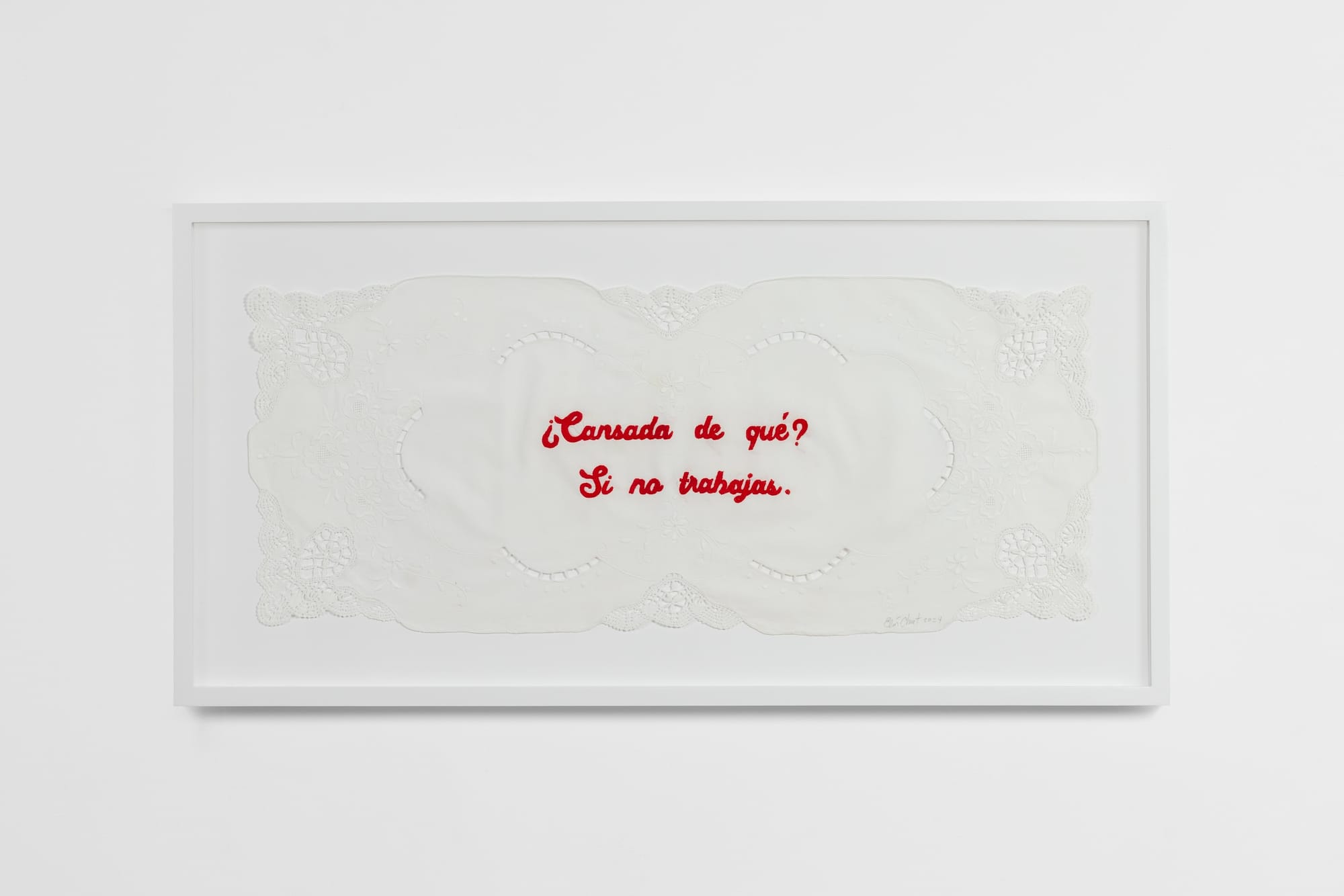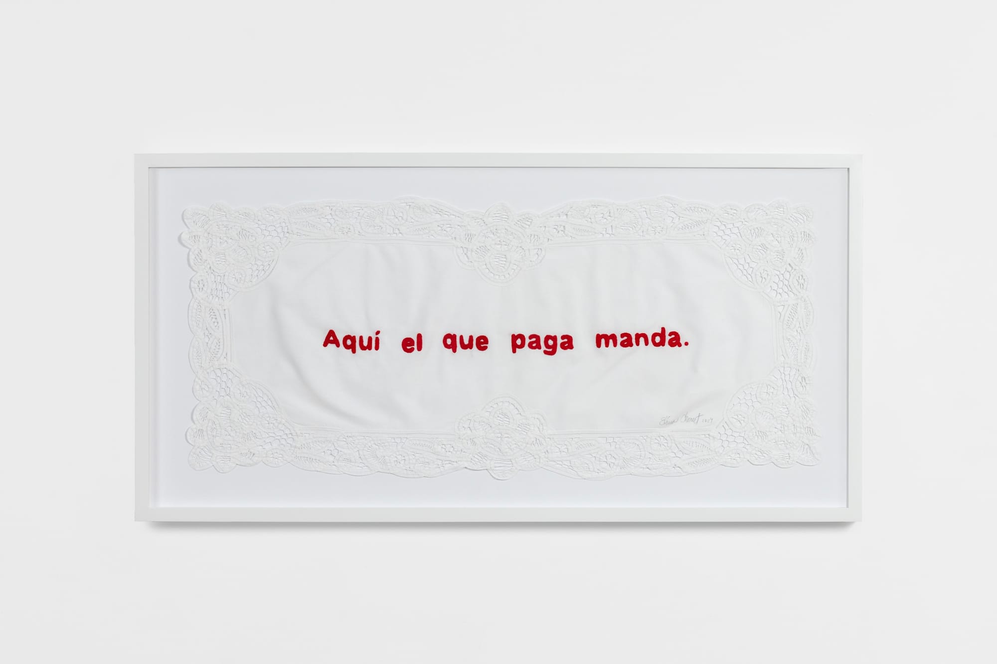 One doily reads “Aquí el que paga manda,” which translates to “Here, the one who pays, rules,” underscoring the gender disparity of unpaid domestic labor and craftwork versus employment as well as the precariousness of financial dependence in abusive situations.