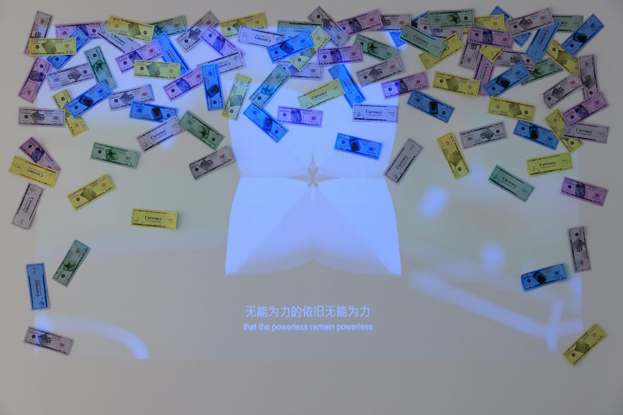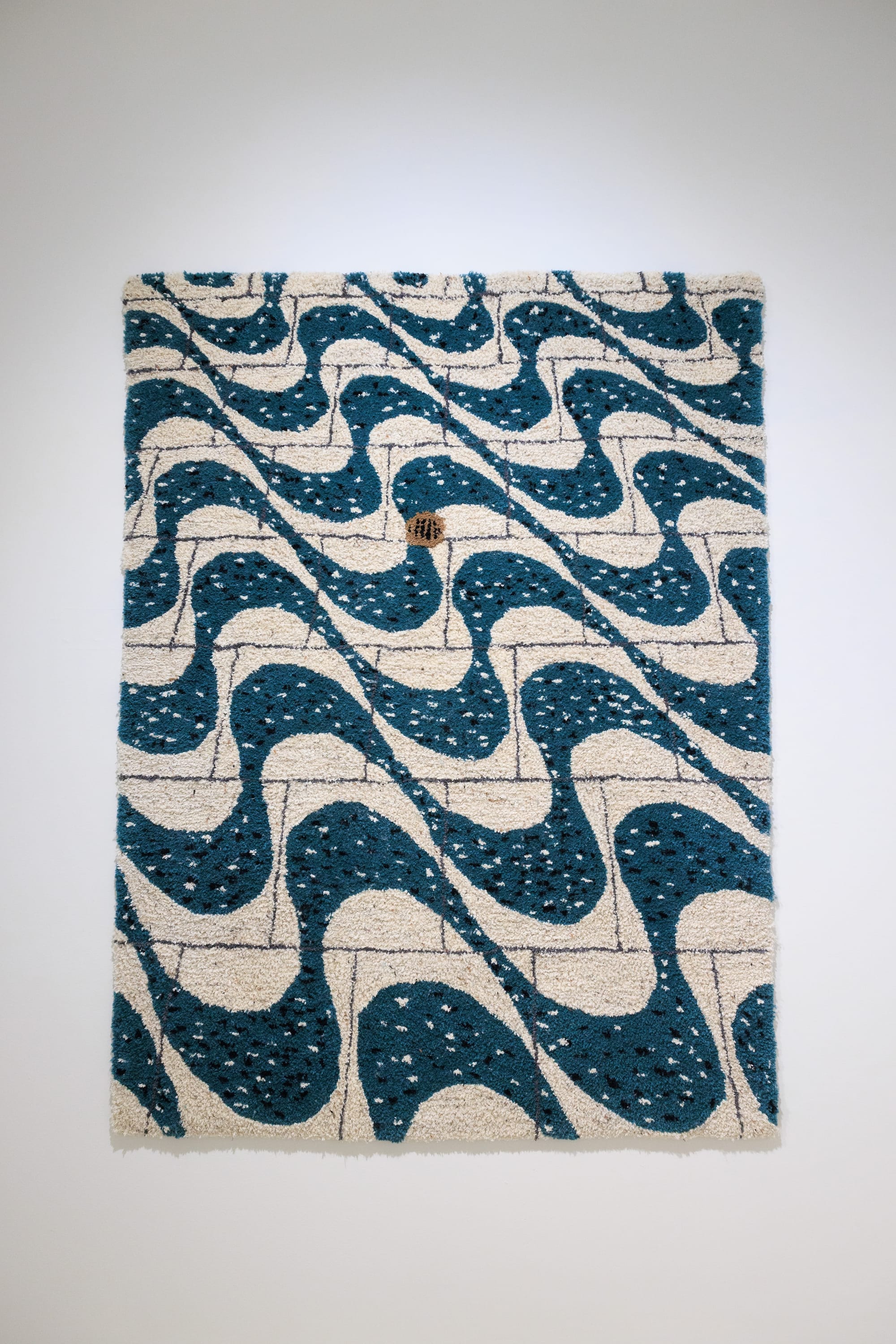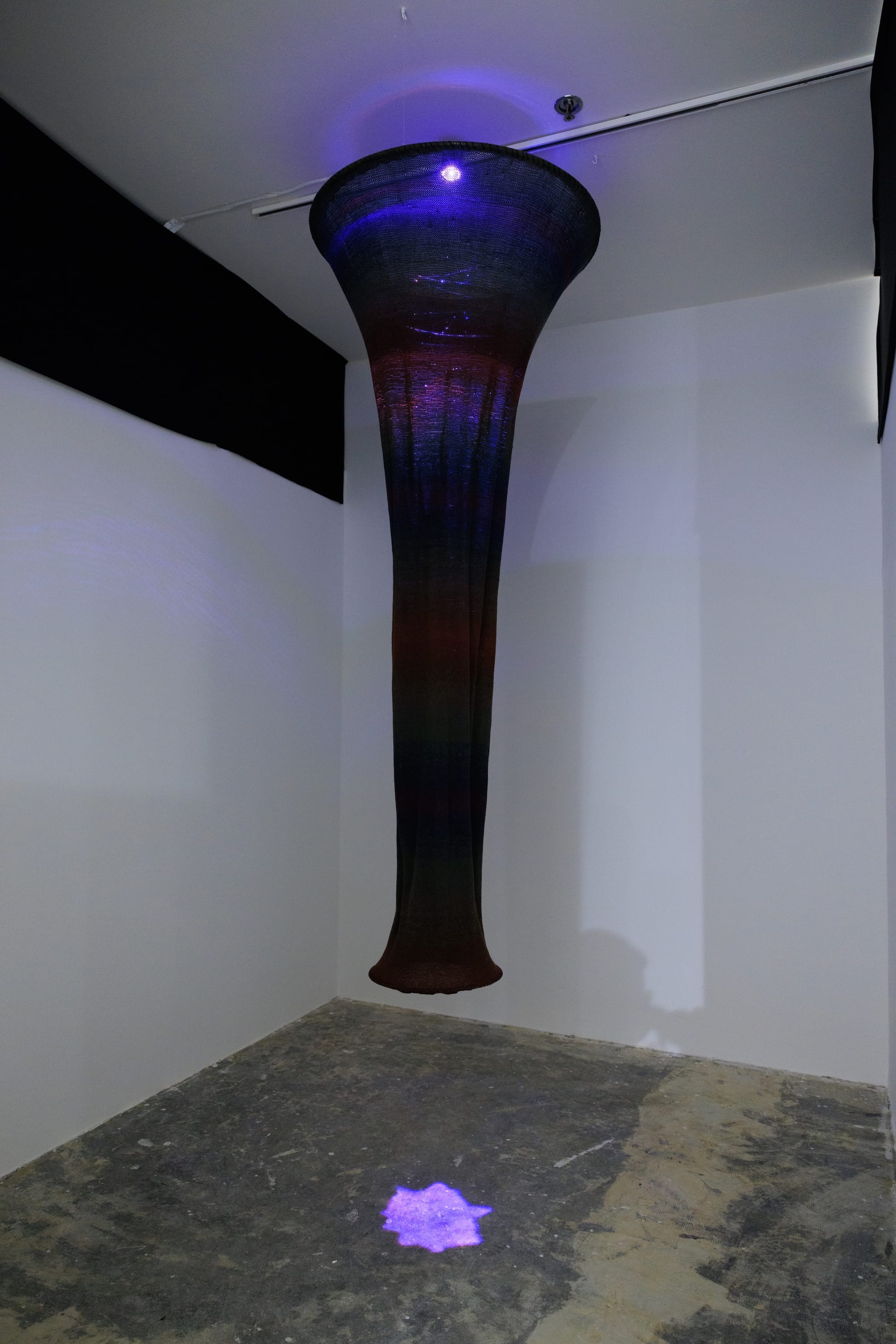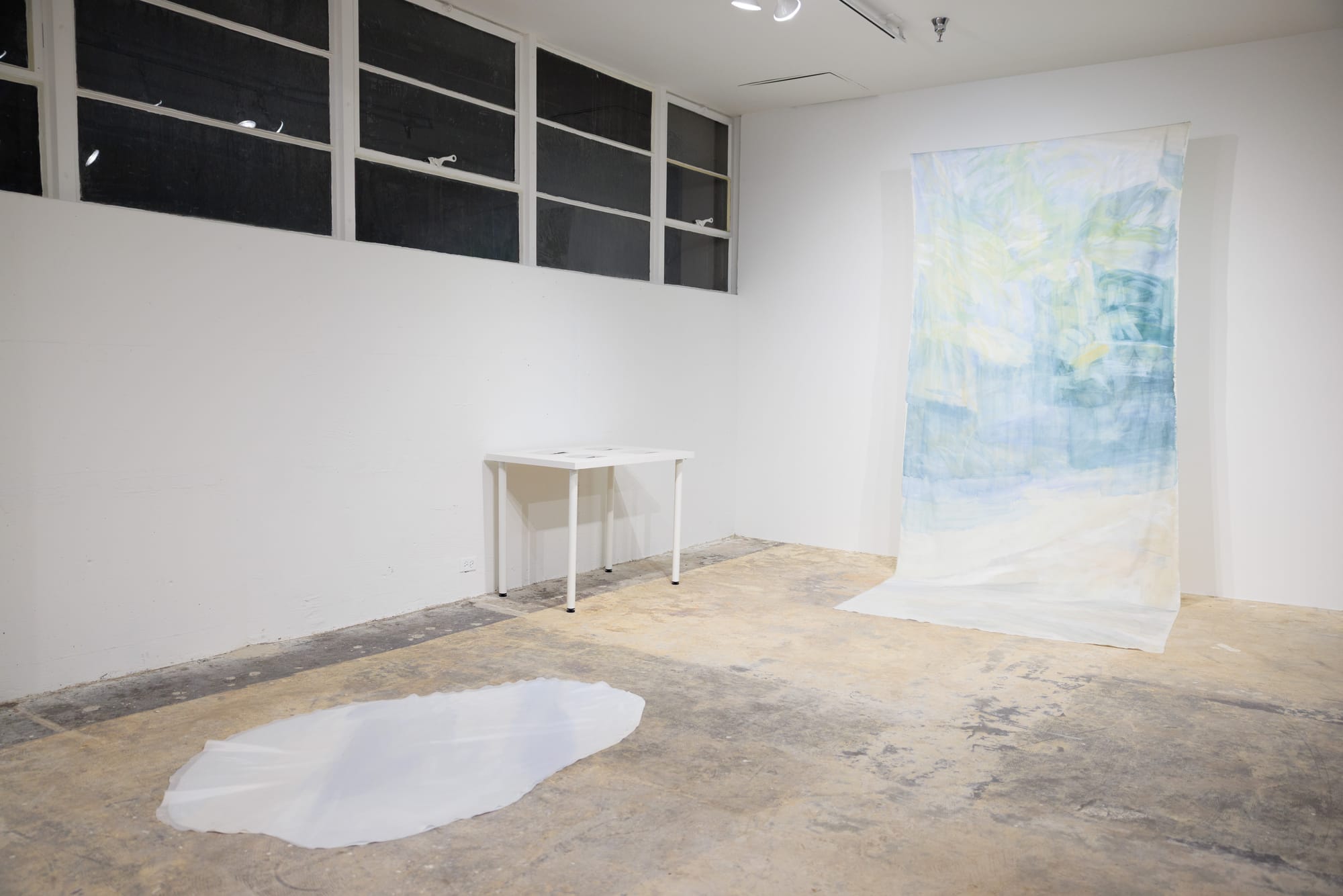 A home can often be like a black box: a system viewed only in terms of what goes into it and what emerges from it, without any details of its internal workings. This concept is literalized in Katrina Parker’s “Expanse,” a tightly woven, hanging cylinder. An LED at its top light emits a purple light that emerges on the other side as a purple illuminated circle cast onto the floor. In Jane Lee’s “Falling walls and floors,” a long white sheet hangs from a thin rod protruding parallel to a wall and pools onto the floor. Lee’s gestural swatches of oil paint disappear into the absorbent, folded fabric, giving the appearance of pastel shadows cast against a drawn, backlit curtain.