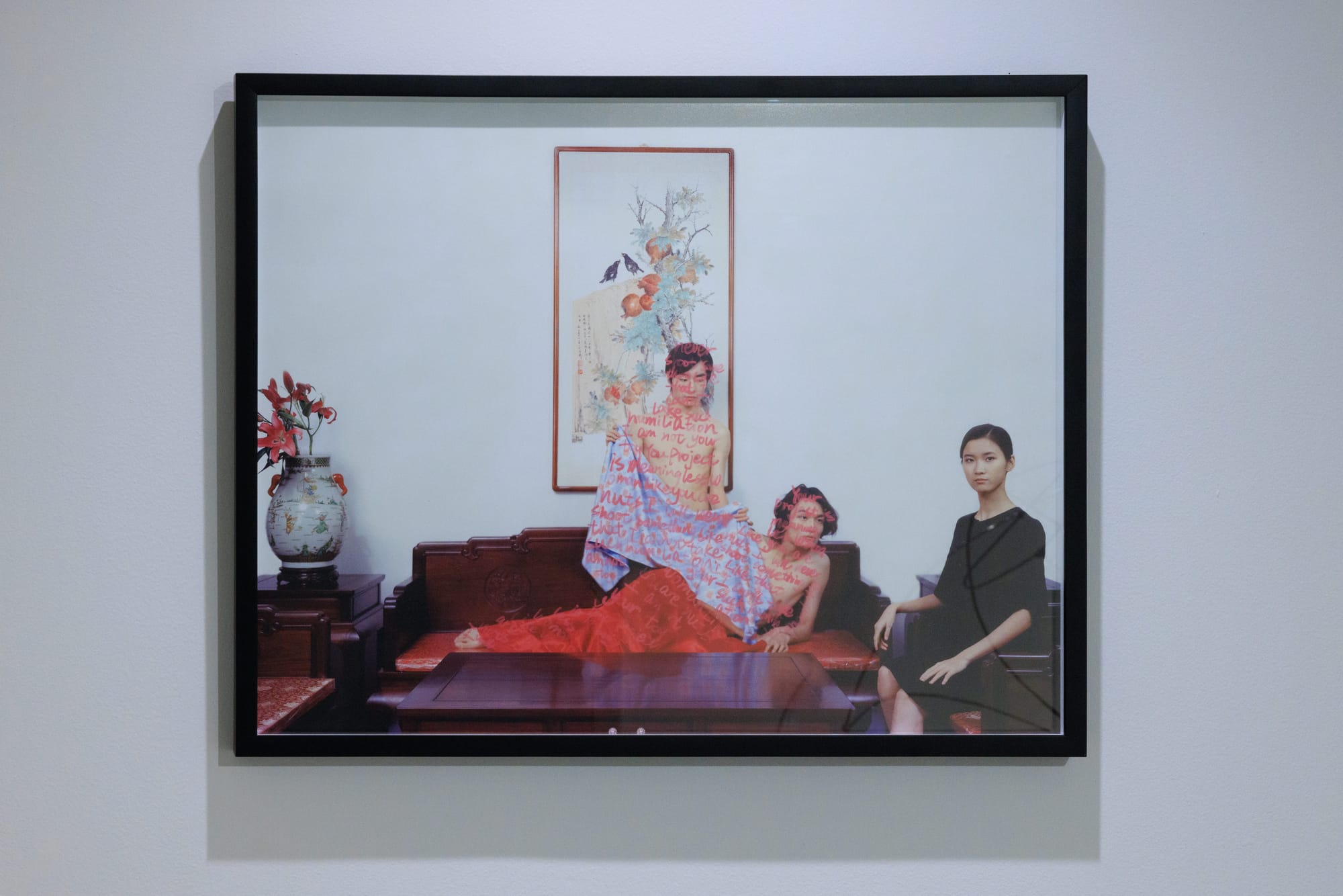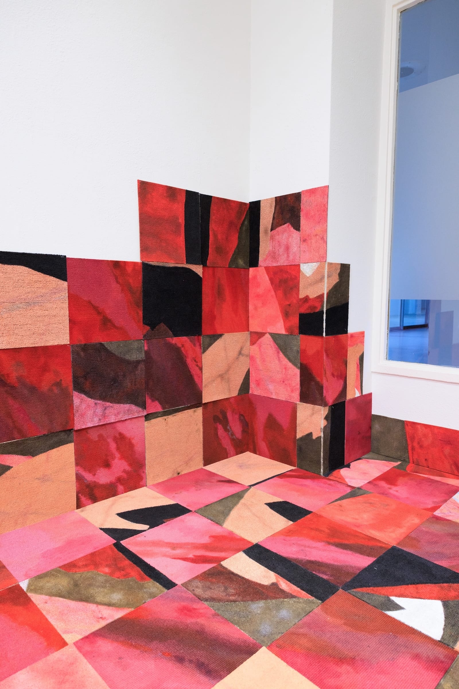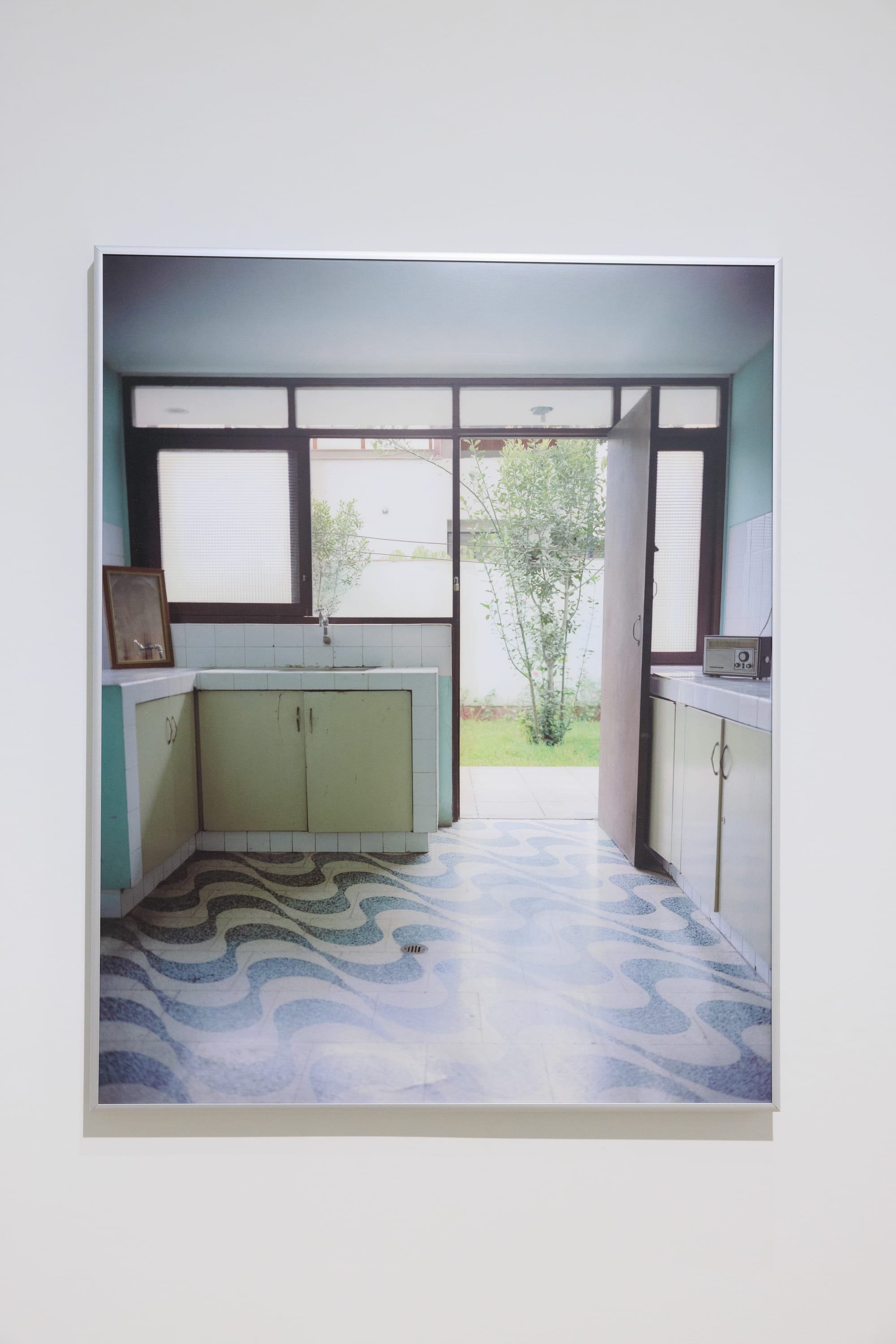 Homes are both physical and emotional spaces, and their details — from childhood bedrooms to tiled floors to photo albums — provide entryways to these exclusive worlds. Chaska Jurado’s “De colores” (all works 2025) features a vivid archival pigment print of a vacant domestic interior with an open door and a swirling, turquoise — and very 1980s — linoleum floor. On an adjacent wall, this same floor transforms into a tufted rug, its thick, bright yarn knotted into the same nostalgic pattern in the photograph it faces (“Translation”). Common house materials both evoke and foreclose legible memories: Jennifer Van’s “Resilience” is a black-and-white image of an outstretched hand reaching toward the camera, positioned in front of a delicate, cropped face. The cryptic photograph stretches across 12 chipped wooden panels, the print interpolated by the lines dividing one slab from another.