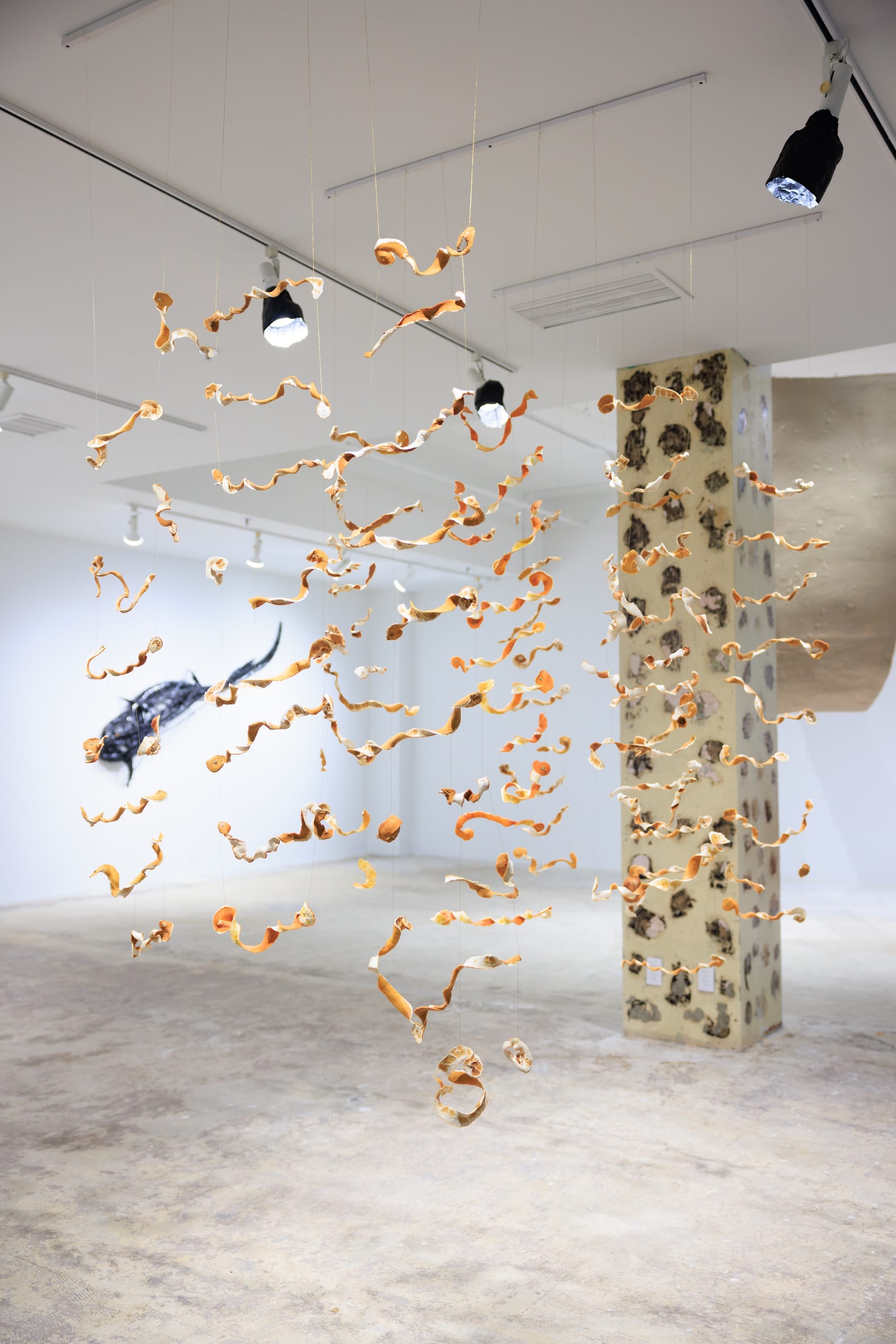 At home, intimate attachments render even banal items with an unpredictable, mysterious power. In Amanda Teixeira’s “how to peel an orange or invisible acts of care,” thin golden thread ties petal-like orange peels in a hanging lattice structure, as though each piece of potential compost were actually an ethereal relic. Just beyond Texeira’s sculpture, Kyle Slevira’s “Flora” displays a white stalk that bursts into a mass of found textiles, each piece of fabric painted white and curled to resemble the inner folds of a tulip or ranunculus.