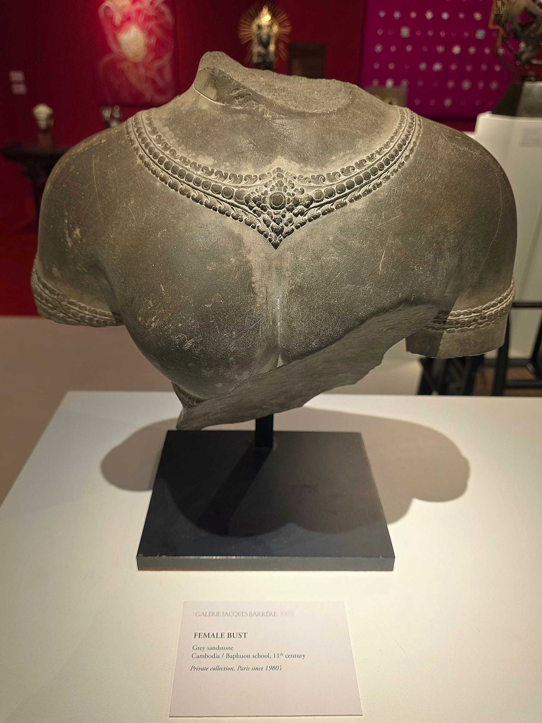 Left: Life-size Roman marble Cuirass of an Emperor on display at the booth of Galerie Chenel at TEFAF Maastricht; right: An 11th-century female bust from Cambodia shown by Galerie Jacques Barrere (photos Summer Austin/Hyperallergic)