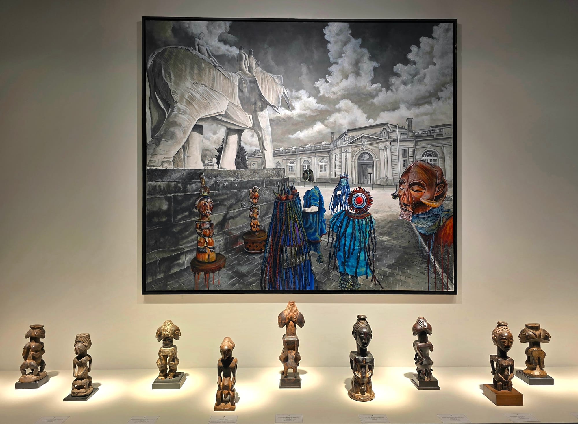 The fair’s programming and exhibitor choices subtly reflect collecting as a form of cultural subversion. The presence of politically resonant works, coupled with an increased emphasis on diversity, suggests a market that is not only responding to demand but also engaging with broader cultural conversations. Amid headlining works by (largely male) artistic giants such as Vincent van Gogh, Titian, Pablo Picasso, Gustav Klimt, Ai Weiwei, and Rembrandt van Rijn, standout presentations spotlighted emerging and historically underrepresented artists. For example, a juxtaposition installation of several ancient African sculptures in front of a striking painting by Cameroon-born artist Franck Kemkeng Noah titled “The Rituals of Museums” (2022) highlighted — perhaps unintentionally — the treatment of African art in Western contexts.