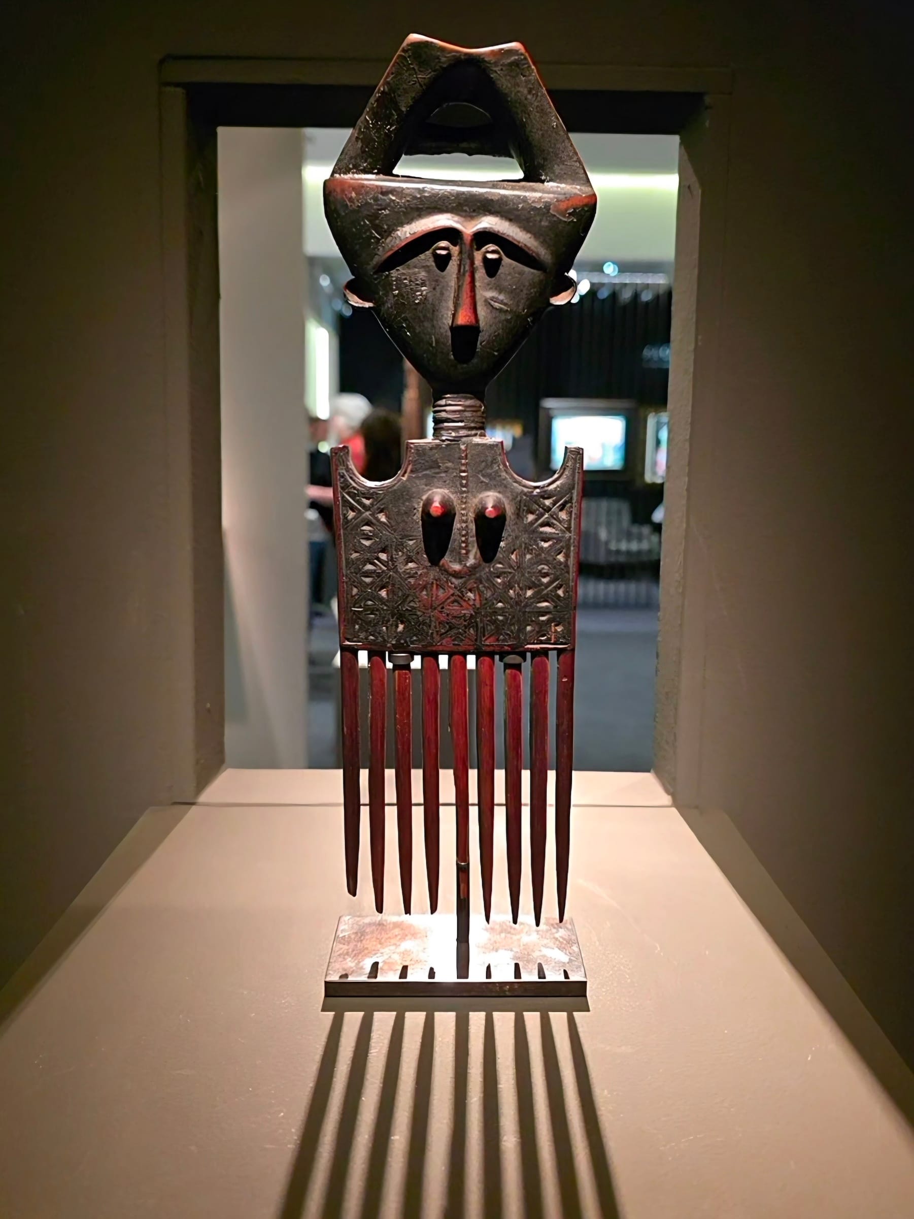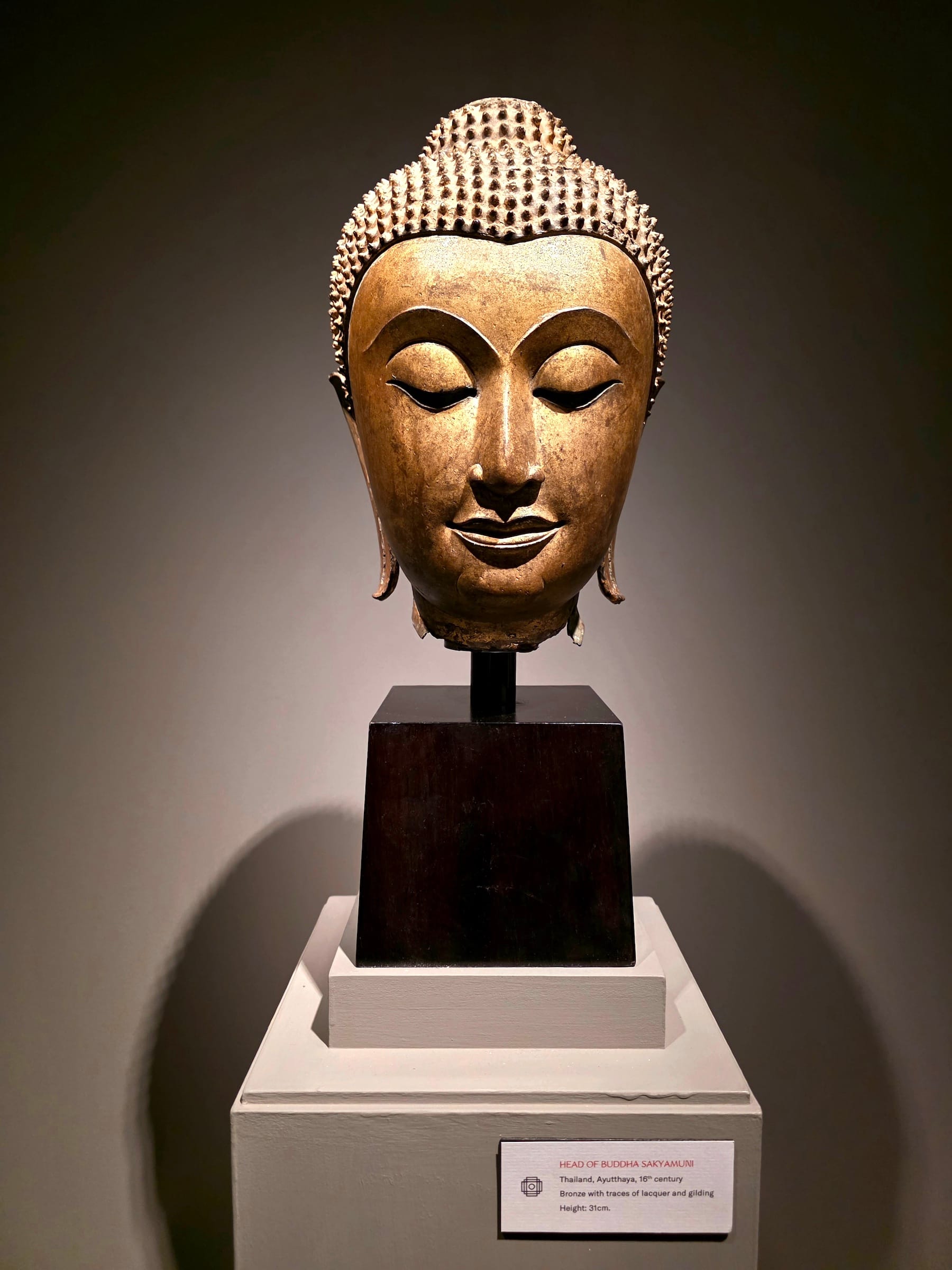 Left: An impressive head of Buddha Sakyamuni from Thailand, on display with Marcel Nies Oriental Art; right: A beautifully detailed Ashanti comb with a female head and torso from Ghana, presented by Yann Ferrandin (photos Emiline Smith/Hyperallergic)