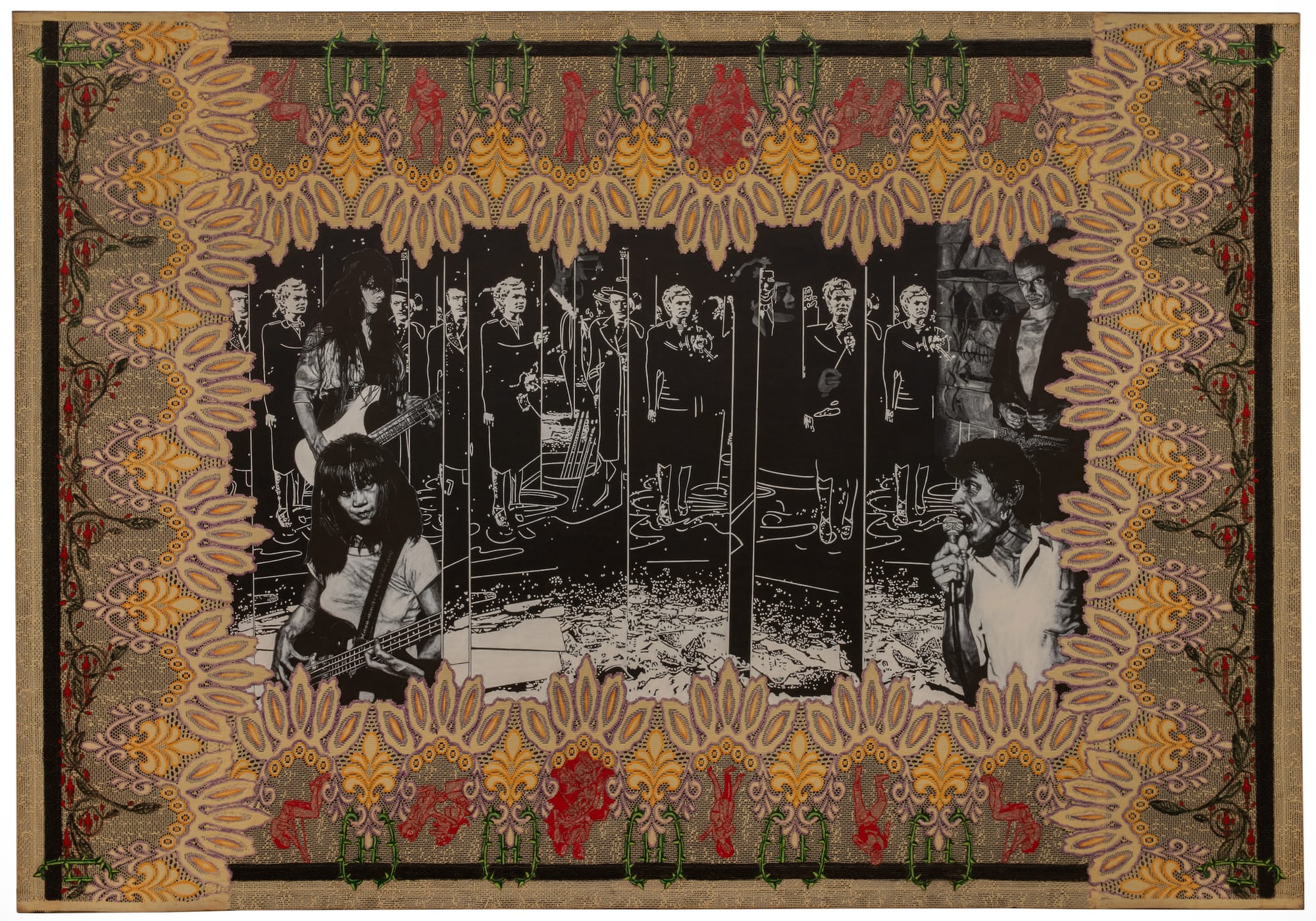 Carole Caroompas, "Heathcliff and The Femme Fatale Go on Tour: The Honeysuckle Embraces The Thorn" (1999), acrylic and found embroidery on canvas over panel (photo by Eric Stoner, courtesy Laguna Art Museum)