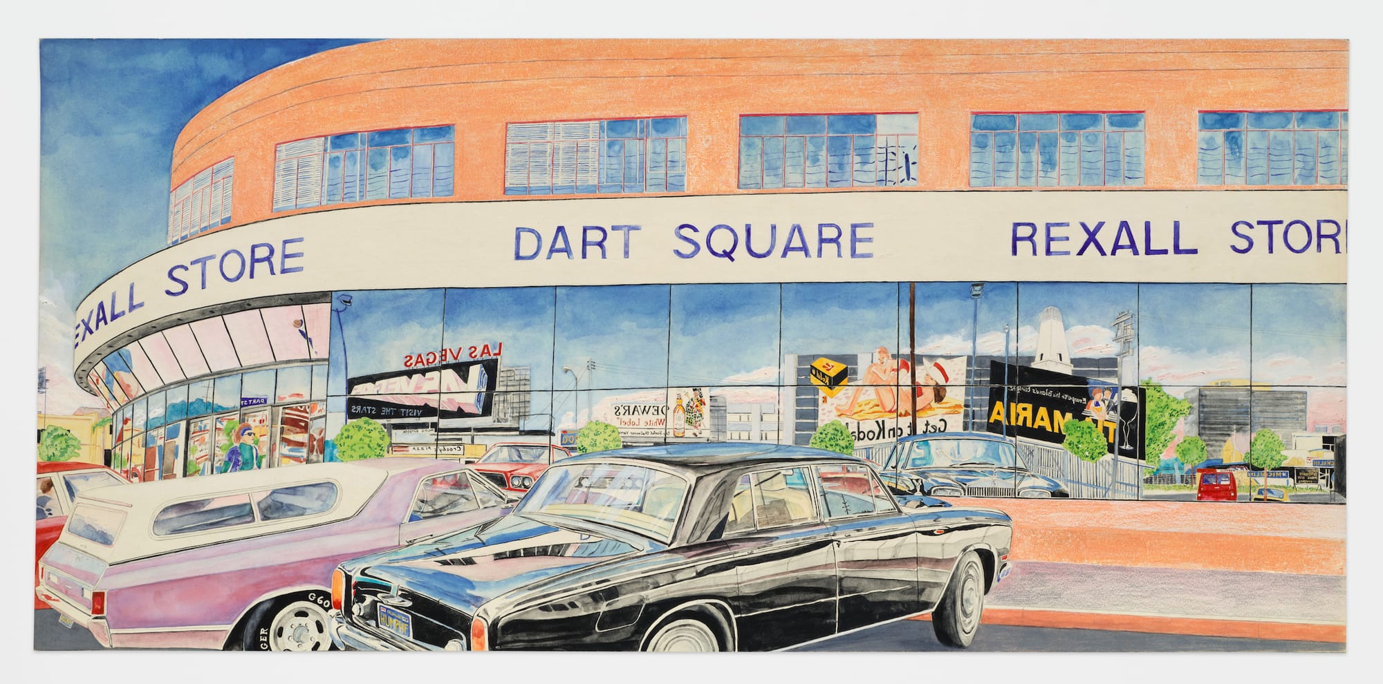 Nick Taggart, "The Largest Drug Store in the World" (1978), watercolor, color pencil, and acyclic on board (© Nick Taggart; photo by Paul Salveson, courtesy the artist and Megan Mulrooney Gallery)