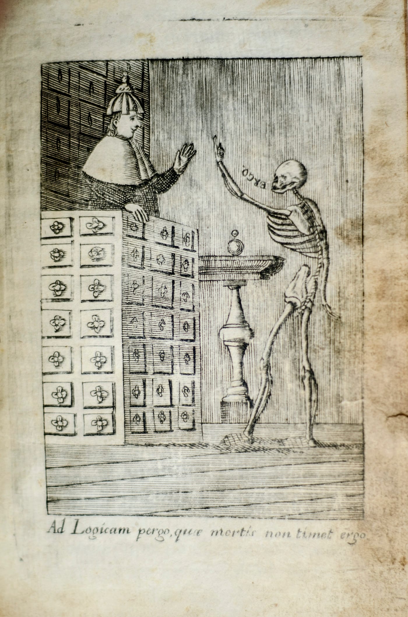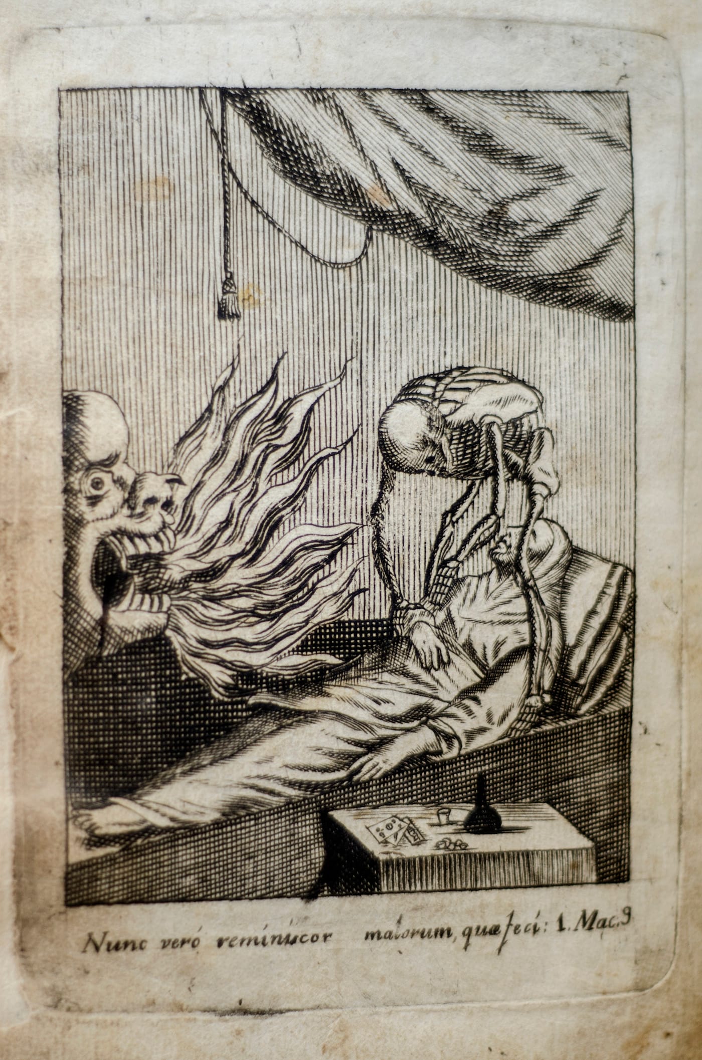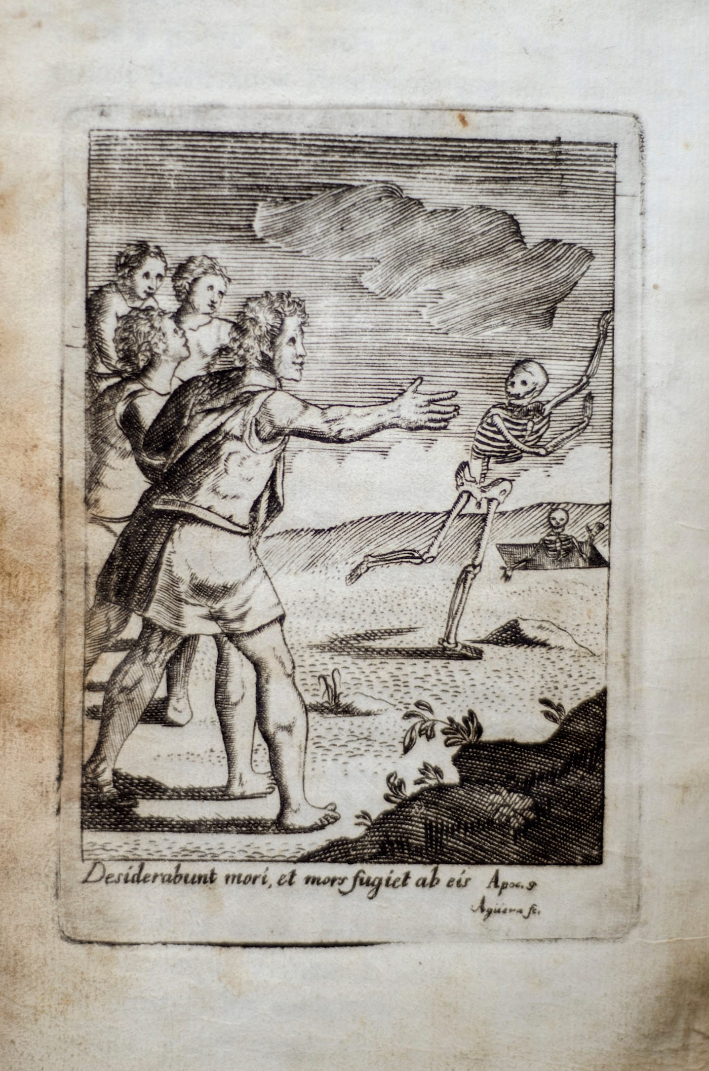 Engravings by Francisco Agüera Bustamante in The Astounding Life of Death show the bony figure in a variety of roles, from a baby to a king.