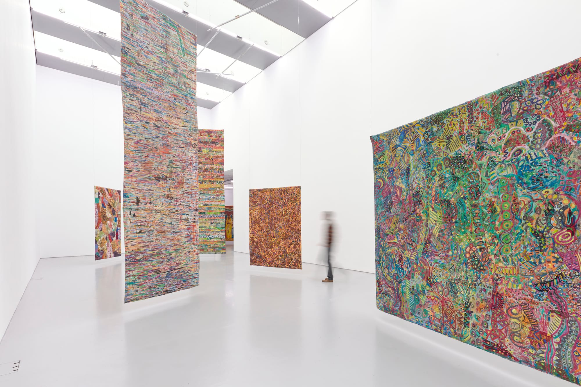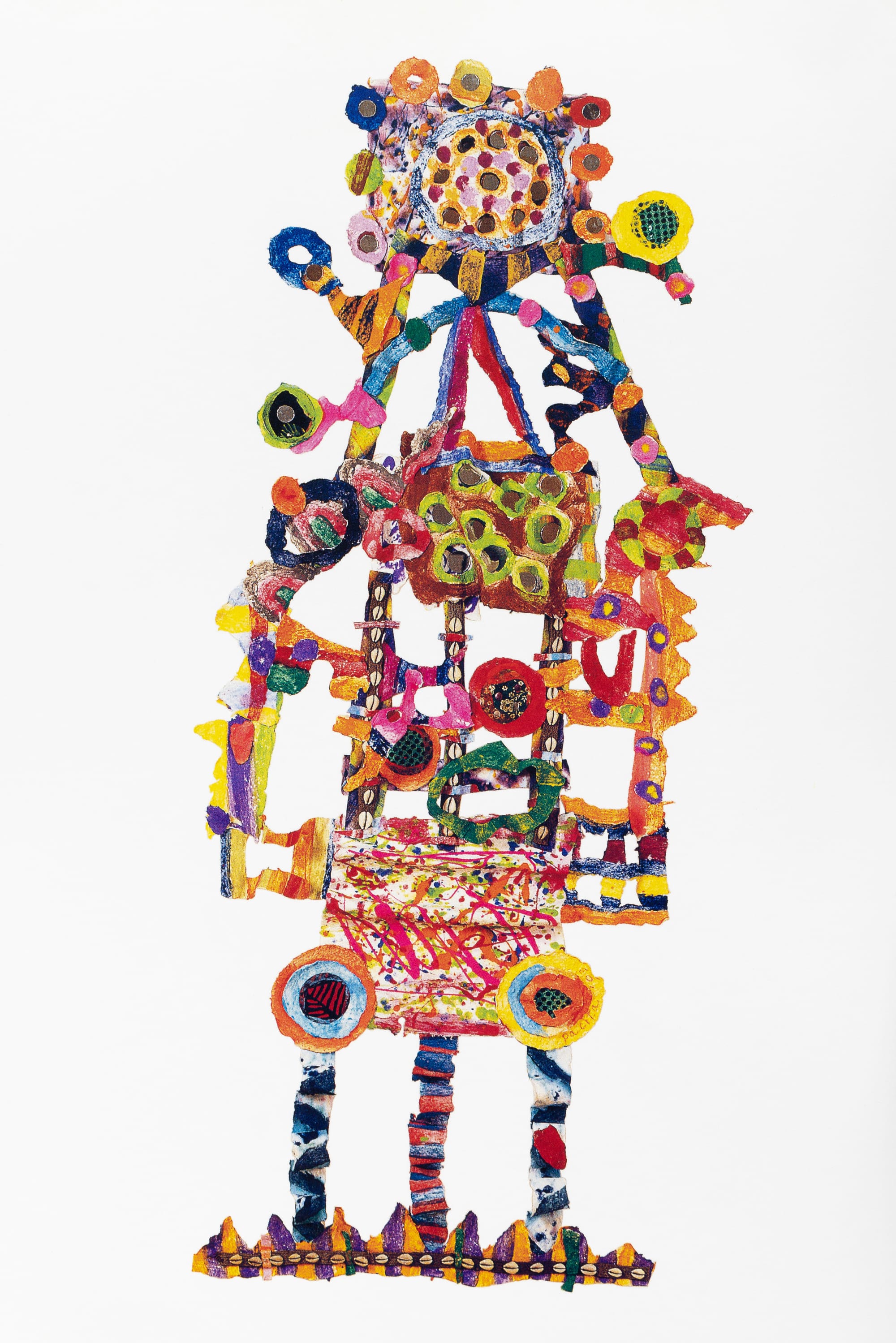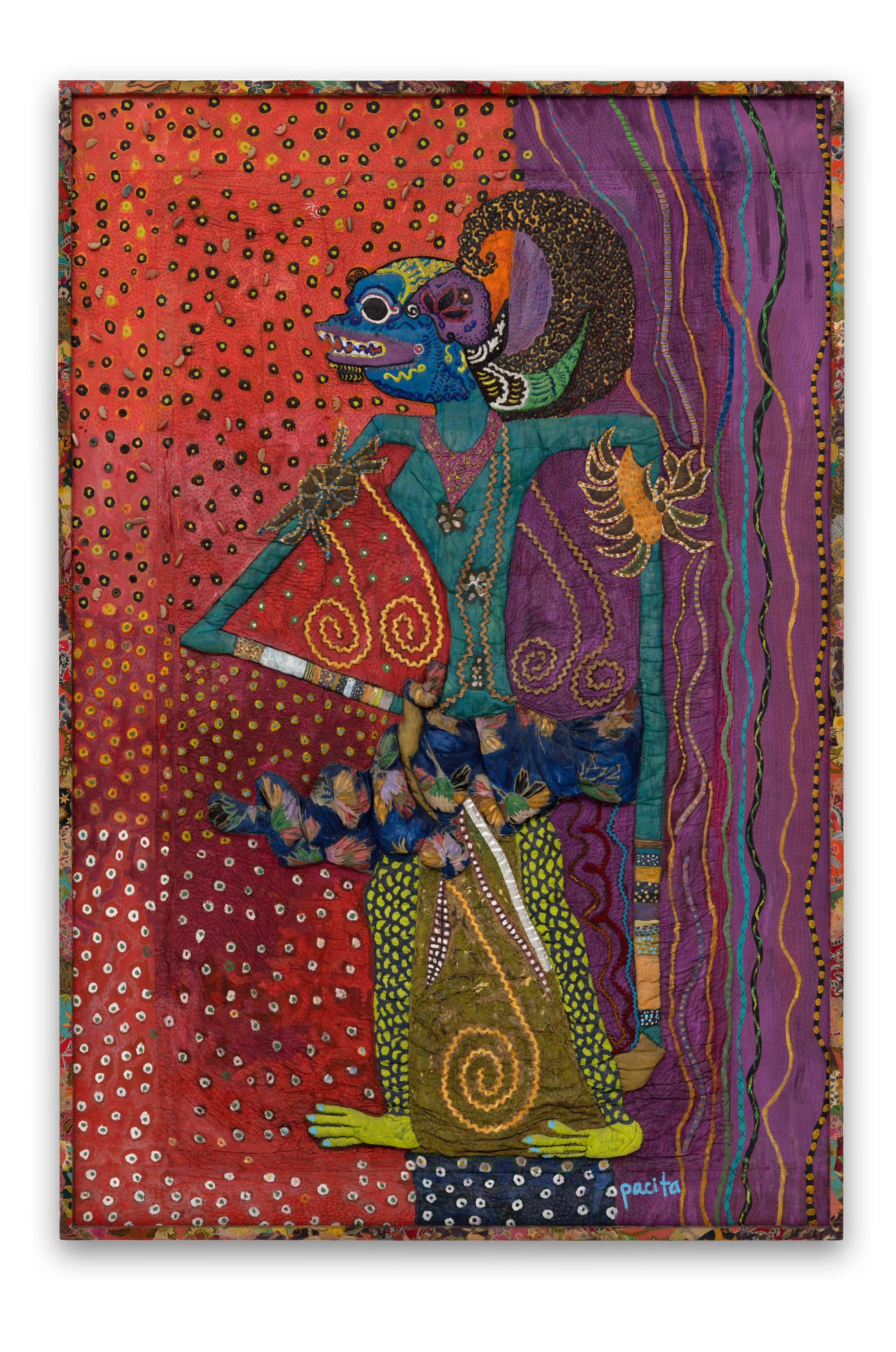 Abad is perhaps best known for her trapunto technique, which is inspired by the Italian embroidery method meaning "to quilt" that involves stuffing and stitching textiles to create a three-dimensional effect. These heavily embellished fiber fields are the synthesis of Abad’s exposure and passionate interest in the Indigenous cultures and traditional crafts she encountered in her decades of international travel. She had a unique capacity for picking up techniques, not to imitate them, but to incorporate them into her own artistic vision. Abad’s major trapunto works are stunning and a true mélange of cultures — running hand-stitching typical to Bangladesh-inspired kantha quilts; the application of cowrie shells traditional to African art; subjects inspired by Indonesian shadow puppets and masks; and an expansive palette that reflects the artist’s roots.