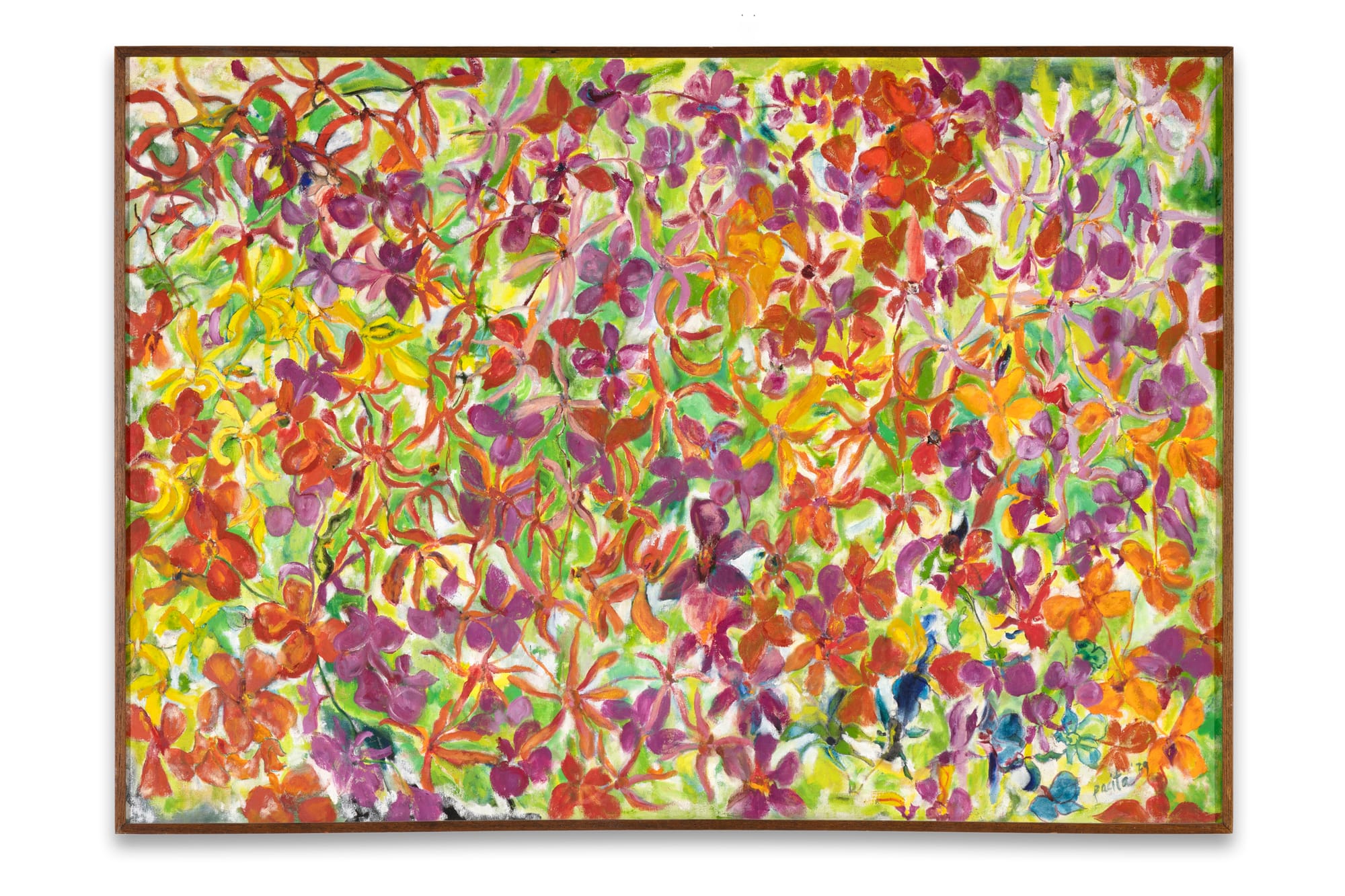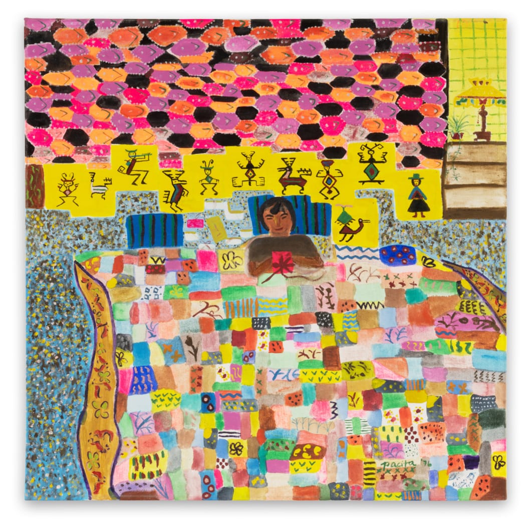 Then there is the work itself. Examples of the artist’s earliest sketches, paintings, pastels, and linocuts indicate an early love of maximalism and color-play, but the influence of fabric motifs became readily apparent in the ’70s. One archival photograph pictures Abad backdropped by a phulkari from Lahore, Pakistan (purchased in 1973), a motif that later appears in the upper field of the painting “Foothill Cabin” (1977).