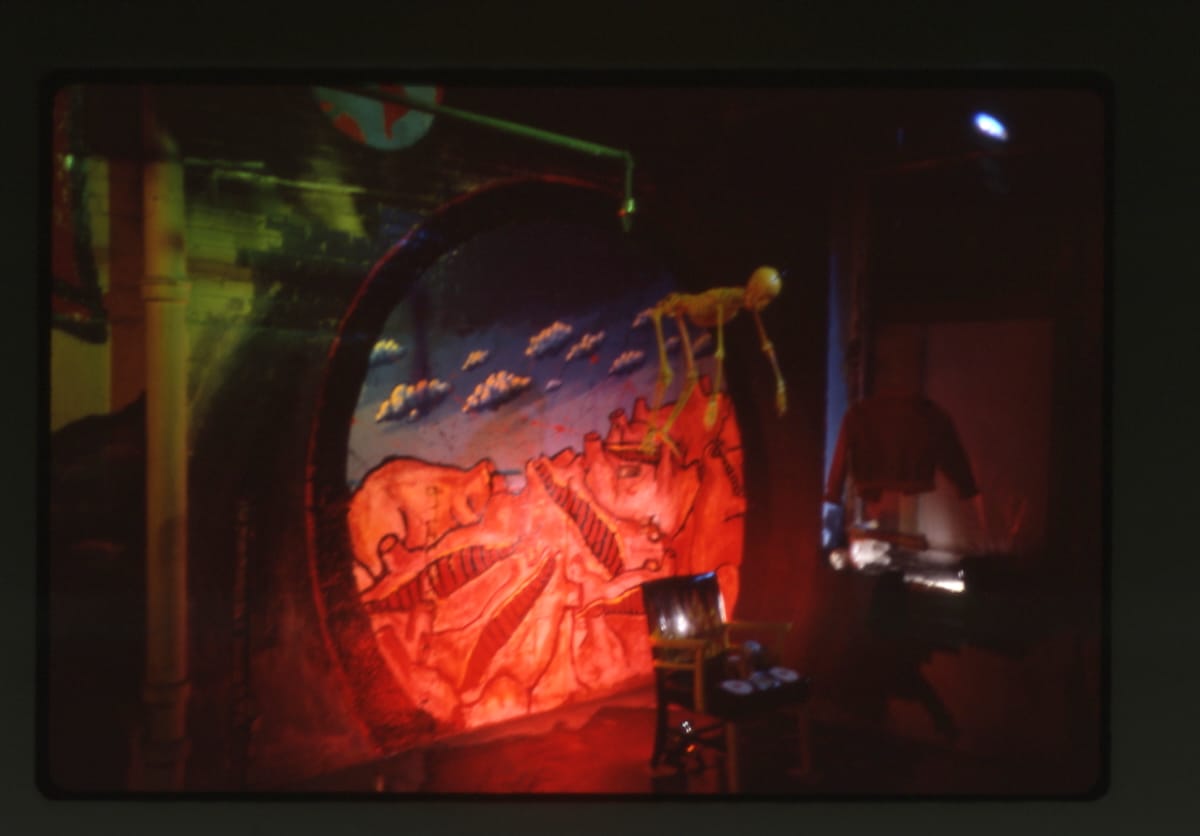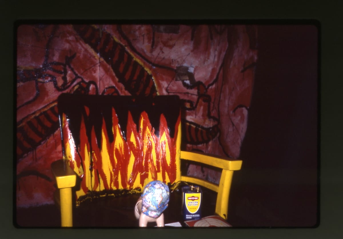 For Missing Children, Wojnarowicz similarly set up props around the murals, including a baby doll, a children's baseball jacket, and a skeleton hanging above a black chair, in what an article in the Louisville Courier Journal described as a "macabre representation of child-snatching." More accurately, this motley tableau reflected the artist's approach of distilling personal trauma into a distinct iconography. The mural depicted motifs that recurred throughout his oeuvre, like the burning house, a symbol of defiance that critic Lucy Lippard called "his first artistic trademark," and the gagging cow, which he rendered on Pier 34 and even on the Berlin Wall. They were ways of giving shape to buried memories, perhaps, or lending agency to those who are voiceless. “David was an artist of incredible integrity,” Glantzman said in an interview with Hyperallergic in 2019. “He was somebody who had no choice but to speak.”