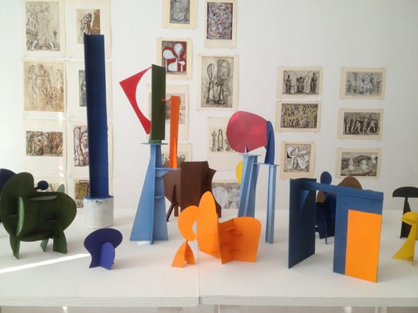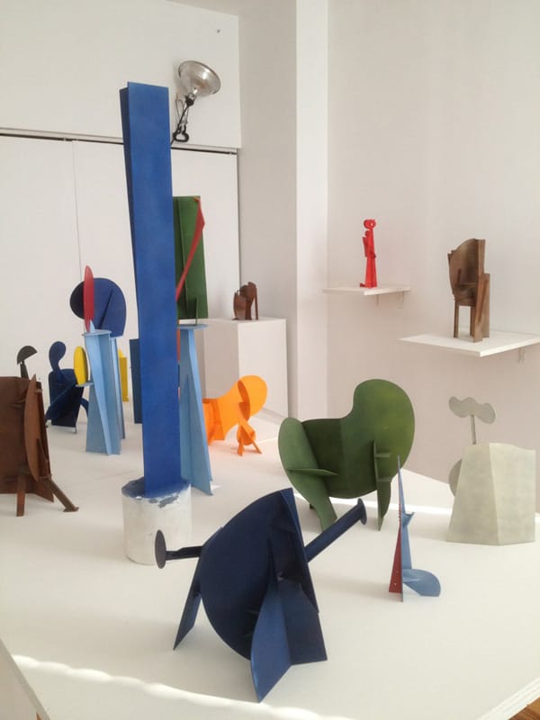 Our gracious hosts transformed their guest bedroom into a semi-permanent living room for art. The artist Peter Stankiewicz’s abstract ramshackle lends itself to the informal environment. His cardboard, “Styrofoam,” plastic painted modernist sculptures filled the white room with colorful whimsy. The maquette-style army of mini sculptures were all the more endearing for their heroic-overtones. I was reminded of a miniature world of modernist whimsy.