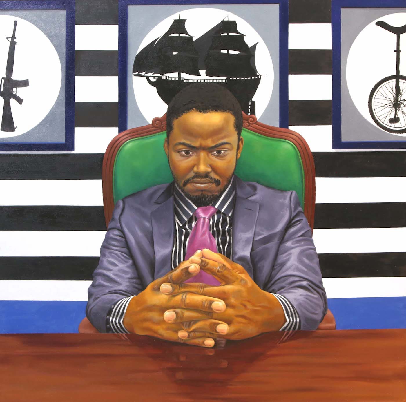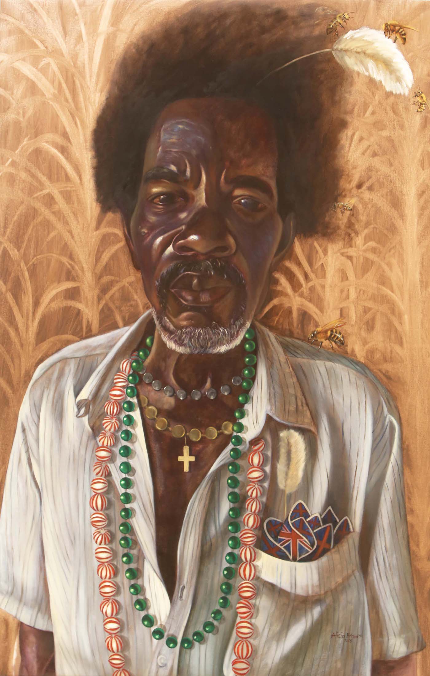 Working in oil on canvas, Bailey produces portraits of contemporary figures — often young, urban, Jamaican men — whom he observes in moments of apparent self-reflection. “I try to capture a sense of each subject’s presence, of what’s invisible, and that’s very challenging” Bailey said, referring to “Colonial Legacies” (2016), his Biennial entry. By contrast, Brown’s rich-in-detail “Exchange” (2016) depicts a country man standing in a farm field. He has a cataract in one eye, a feather in his hair, a bee on his shoulder, strings of beads around his neck, and a dapper handkerchief decorated with British Union Jacks in his pocket. This painting’s precision is penetrating.