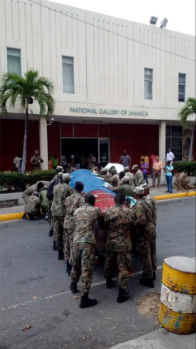 A lot of that energy can be felt pulsing through the current Jamaica Biennial, which certainly gives its organizers and artists something to boast about — never mind that it opened a bit later than expected, or that it took 34 soldiers from the Jamaica Defence Force to carry Facey’s big, long drum from a flatbed truck into the museum building, whose plate-glass doors and windows had to be removed to let it in.