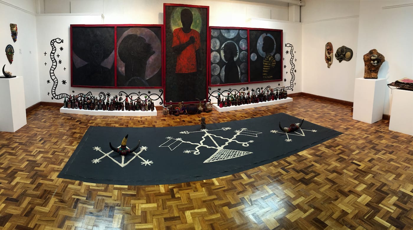A number of artists in this Biennial have sought to make palpable a tug of war between thoughts and emotions, society and history. Xayvier Haughton, who, like many of the exhibition’s participating artists, studied at the Edna Manley College of the Visual and Performing Arts in Kingston, often explores what he refers to as the “Afrikan” consciousness. Here, he brings that awareness, allusively, into a Jamaican context in “Vodou: The Philovisualization of Damballa Hwedo, Giving Rise to the Afrikan Vanguards” (2015-2016), an installation whose gathering of painted bottles, wall drawings, animal horns and nearly silhouetted black figures creates an altar-like setting.