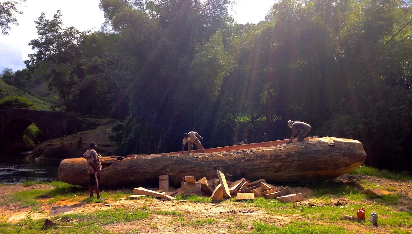 Facey, who is known for large-scale, abstract sculptures made from tree trunks, as well as mixed-media installations addressing, in a spiritual-mythical way, the soul-scarring events of the slavery era, lives and works on a farm in the north-central Jamaican parish of St. Ann. “The cotton tree that became ‘Ceiba’ had come down in a big storm, and I had my eye on it for some time before putting together a team to haul it to my workshop,” Facey told me. She and her fellow woodworkers stripped off the rescued trunk’s bark, etched and color-stained its surface, and hollowed out its soft interior to reduce its weight. The Jamaica-based artist Fosuwa Andoh helped Facey install cow skin drumheads on each of the sculpture’s open ends.