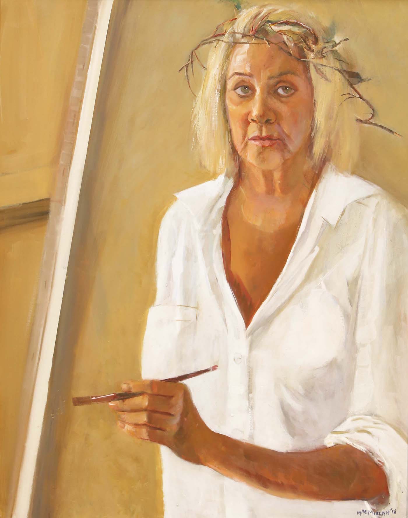 Upon entering the museum in downtown Kingston’s waterfront district, Biennial visitors first encounter “Self-portrait Wearing a Crown of Thorns” (oil on canvas, 2016), by Judy Ann MacMillan, a well-known Jamaican maker of portraits and landscapes who recently turned 70 and marked the occasion with a mini-retrospective that took place elsewhere in the capital late last year. (A book, Judy Ann MacMillan: Still Painting After All These Years, was published in conjunction with that exhibition.)