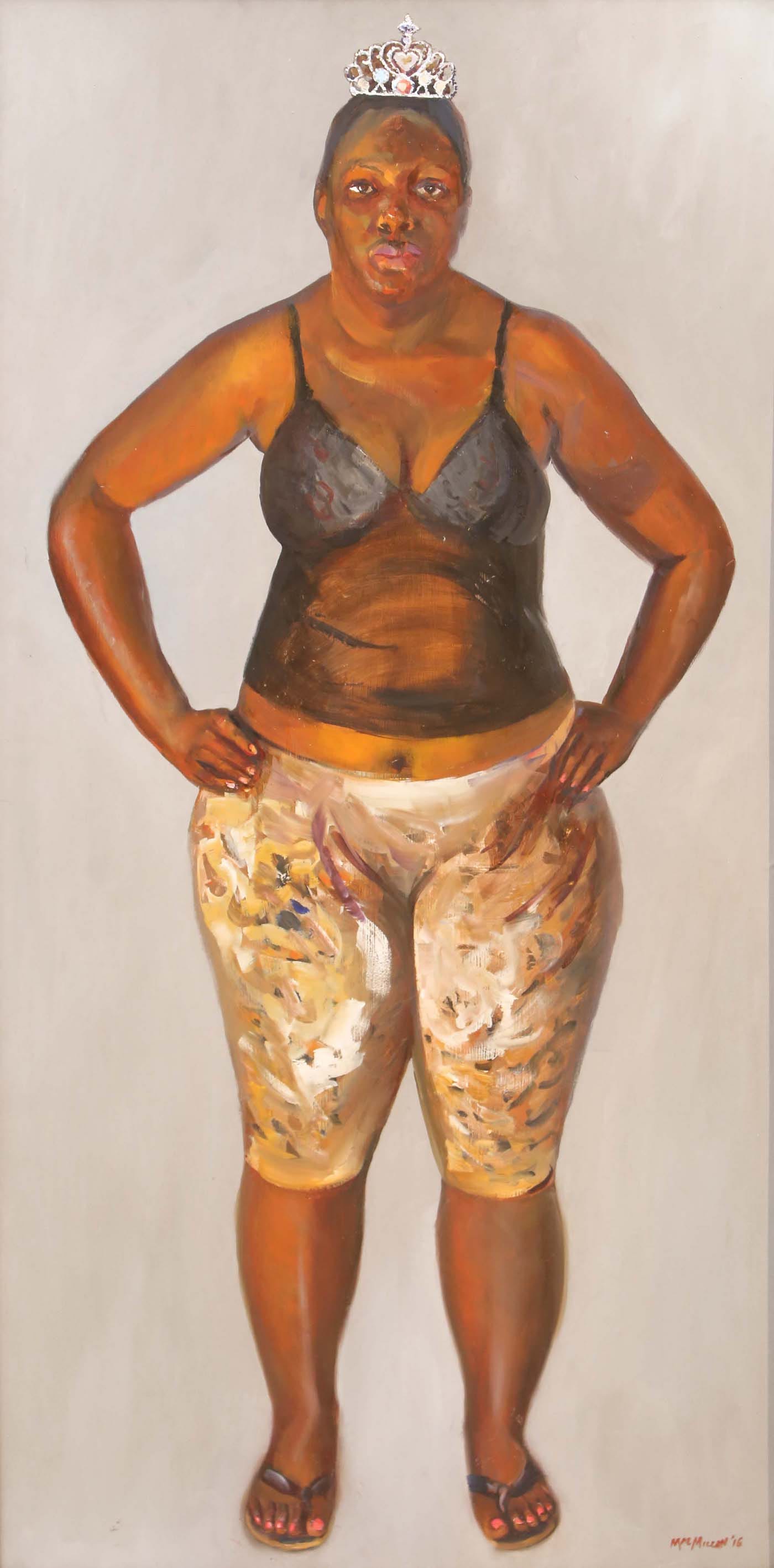 “To be a painter — it’s a way of life,” she observed. “A painter lives for color, light, and the discoveries the next picture may bring.” In the current biennial, MacMillan is also represented by “Village Venus” (oil on hardboard, 2016), a portrait of a young, standing black woman in short-cropped tights, tank top, and a toy crown, gazing into the distance. MacMillan’s painting is an essay in light, color and form, but also a study of the mixed emotions and forces — vulnerability, defiance, resignation and maybe a certain kind of strength — that are concentrated in her subject’s face, especially in her eyes.