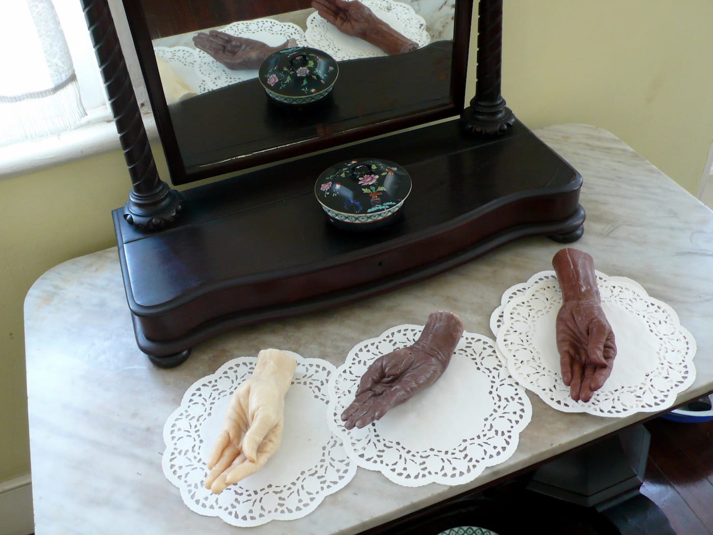 Installed in a bedroom at Devon House, Chung’s “Pure” (2016) consists of cast-in-soap sculptures of the outwardly extended hands of elderly women. They were cast from the hands of actual Jamaican midwives, whose skillful intervention at the very start of a new life’s journey represents a first point of contact, physical and spiritual, between members of the human family. “They’re lying in porcelain bowls here, without any water nearby, because it’s a historic house,” Chung explained, “but ideally I like to have water available so that viewers can actually touch the sculptures, use them to wash their hands and come in contact with these other ‘hands.’”