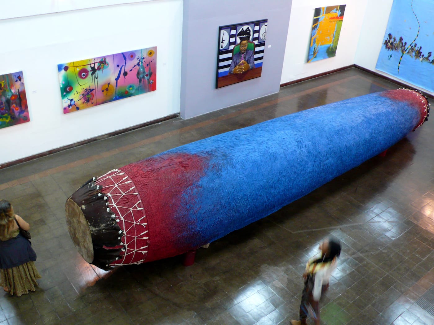 According to Guinness World Records, the largest drum in the world can be found in South Korea, but in the current Biennial, the Jamaican sculptor Laura Facey seems to be giving that massive, traditional-style instrument a run for its money with “Ceiba” (2016), her own 32-foot-long drum.