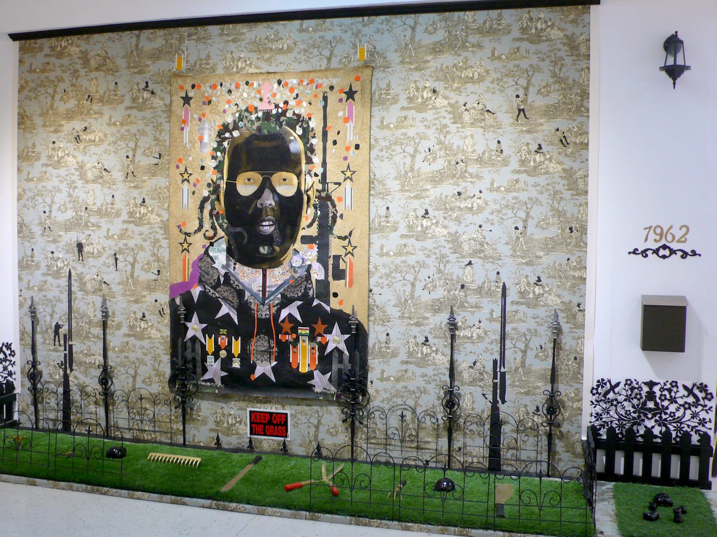 Also working in mixed media, the Kingston-born artist Phillip Thomas offers the large installation work “High-Sis in the Garden of Heathen” (2017), which seems to ring several thematic bells at once, questioning conventional readings of history, the nature of power, and the latent meanings of objects and symbols (a lawn fence, a machete and garden tools, a black baby doll) that are so common they have become banal. (Thomas’s recontextualizing of his subject matter may well exemplify an old-school, contemporary-art lingua franca that is common beyond his homeland, but for many artists in Jamaica and the Caribbean region, appropriating and recontextualizing still pack something of a daring, subversive, purposeful punch.) Thomas uses toile de Jouy-style, patterned fabric as a backdrop for his installation. Its motifs feature courtly figures, which he has amended by painting the visible arms and faces of their well-dressed female forms solid black.