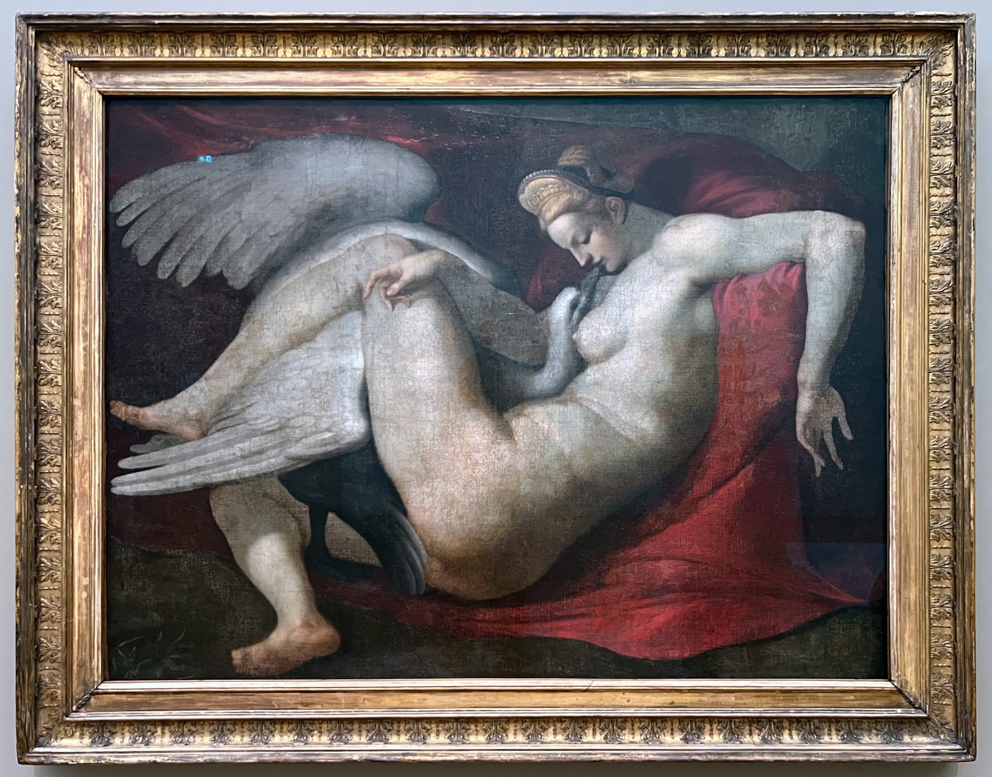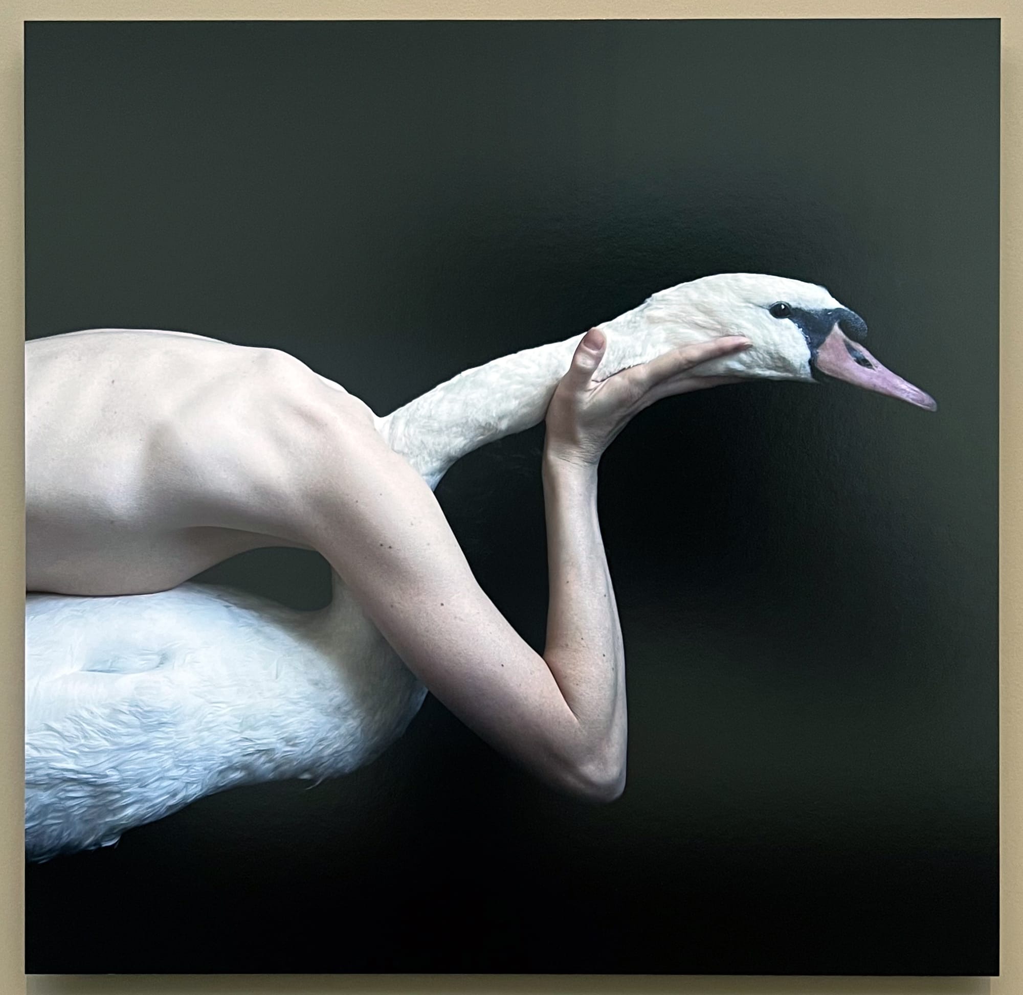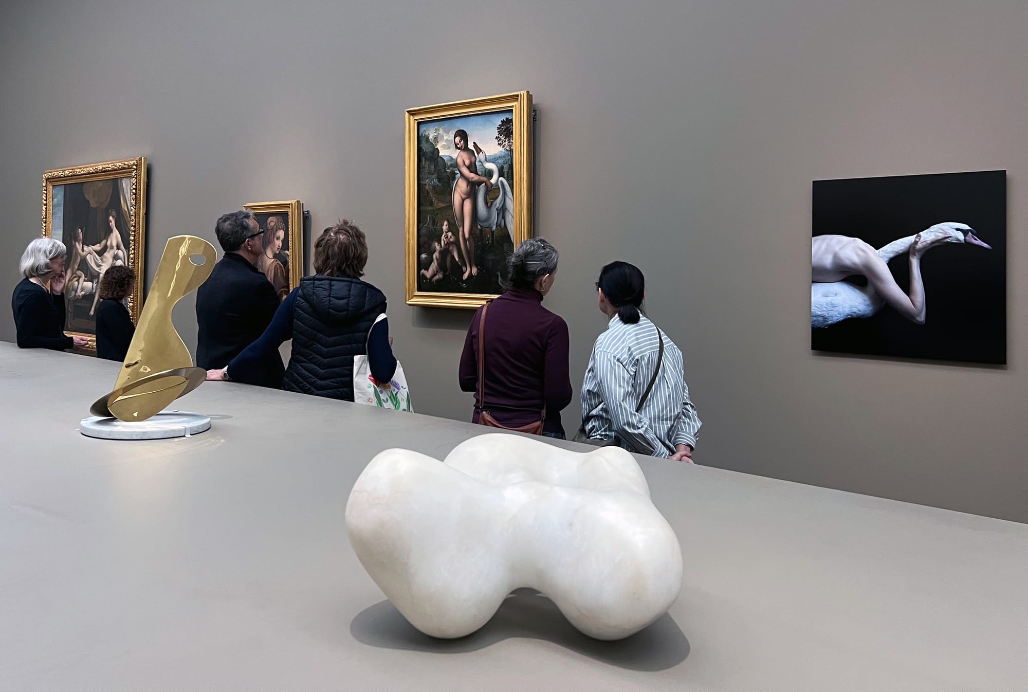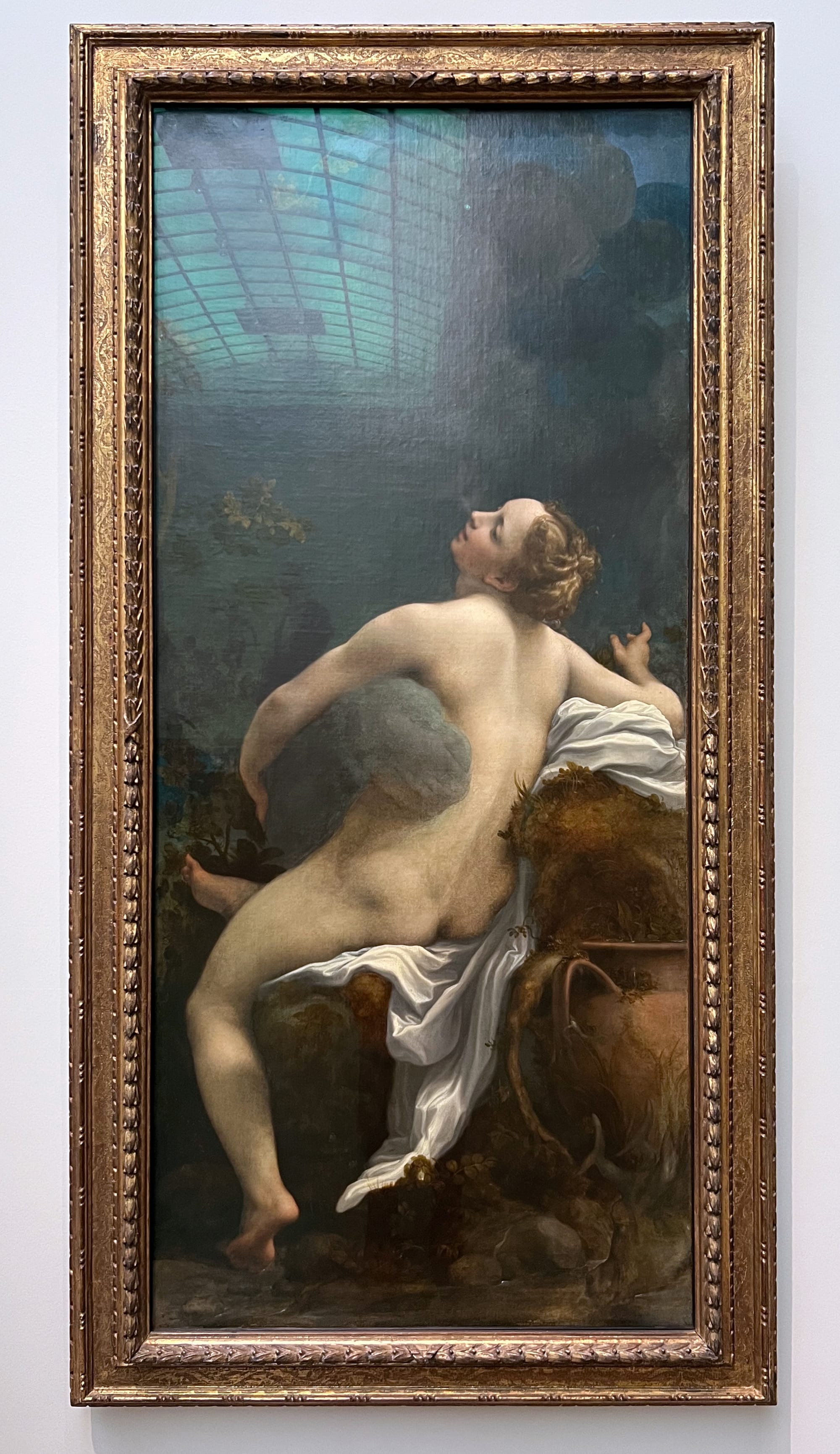 Later galleries explore the awe of metamorphoses begotten by distinctly awful means. In rooms devoted to stories about women, it is not the women themselves who shape forms — rather, it is the jealousy, sexual violence, or sheer whim of the gods that births figures into both literal and metaphorical chaos. In these works, the body is made to be violated by non-human forms representing inescapable powers. For example, images of the god Jupiter’s assaults against women are depicted with voyeuristic eroticism in both Renaissance-era paintings and a modern sculpture: A copy of Michelangelo Buonarroti’s “Leda and the Swan” (after 1530) imagines the instant of Leda’s rape by Jupiter-turned-swan as a heady embrace. Correggio renders another assault as natural submission in “Jupiter and Io” (c. 1531–32), in which the latter embraces the god in the form of a dark cloud of fog, seemingly with pleasure. A masturbating Danae waits for a shower of gold in Hendrick Goltzius’s lush painting “The Sleeping Danae Prepared to Receive Jupiter” (1603). Juul Kraijer’s “Untitled” (2016), a photograph of a woman’s seamless entanglement with a swan, resists the horny gaze, but its presence alone isn’t enough to prime visitors to think through this dissonance between sensuousness and violence.