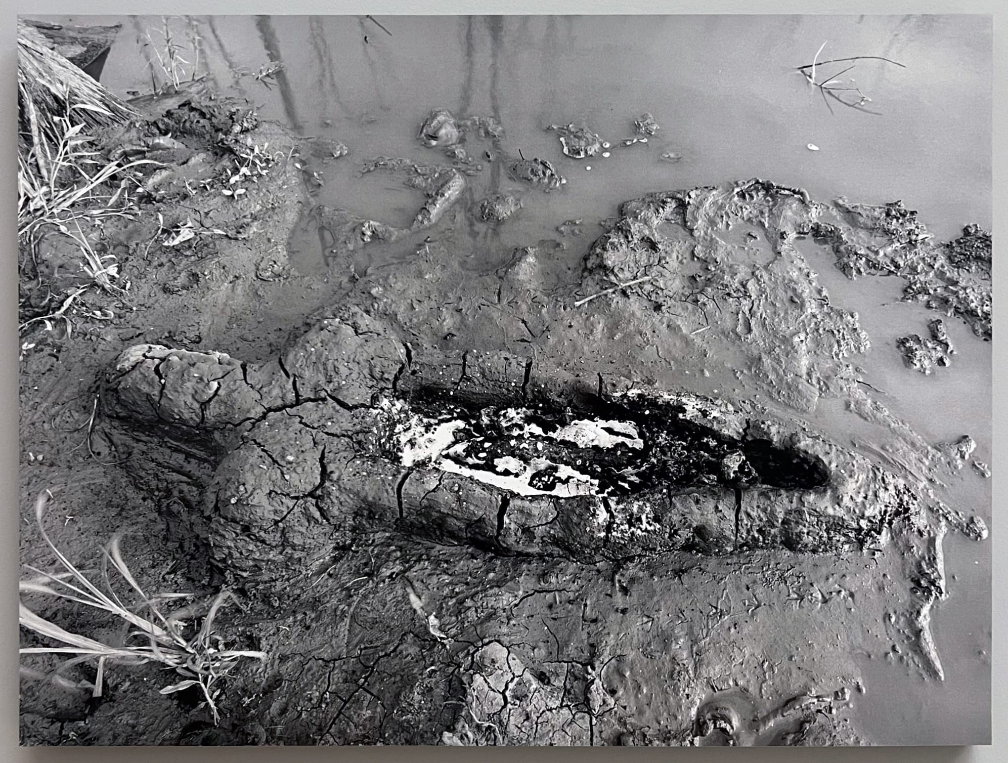 According to the introductory wall text, the overarching theme of Ovid’s poem — and by extension, the exhibition — is the tension between endless transformation and an overdetermined world. The second gallery, a relatively tiny room dedicated to Ovid’s myths of chaos and creation, best embodies this theme. Here, Finson’s “Elements” hangs adjacent to Constantin Brâncuși’s “Promethee (Prometheus)” (1911), a round piece of smooth marble in which slight indentations and protrusions suggest a human face. Across the wall sits “Birth (Gunpowder Works)” (1981), Ana Mendieta’s black and white photograph depicting an earthwork in the vague shape of a female body lying atop a lightly flooded landscape. The entire bottom half of the figure is vulva-like in shape, with smoldering ash resting in its orifice.