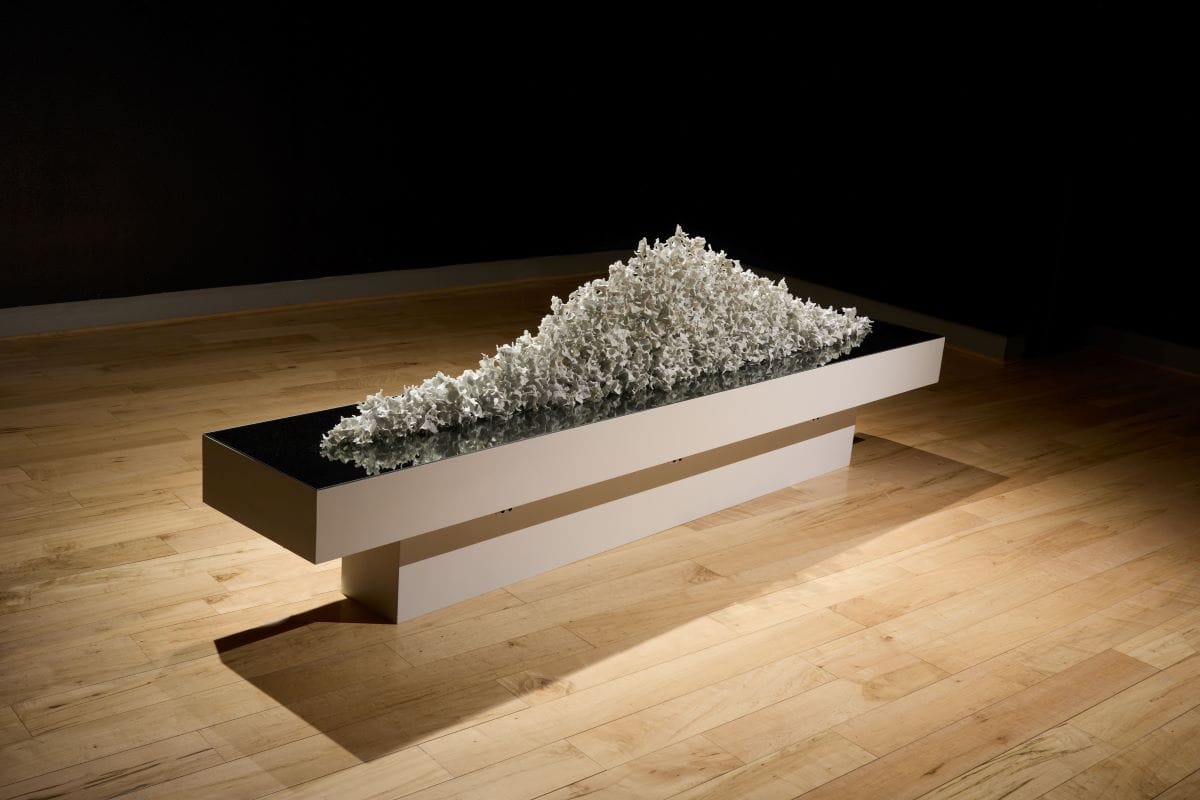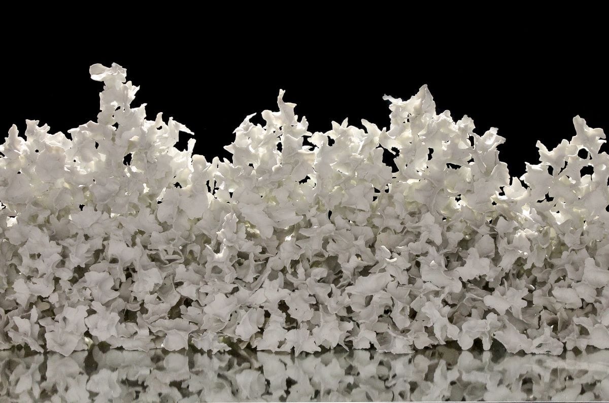 Interdisciplinary artist Christine Cassano stacked over 500 translucent porcelain forms resembling human vertebrae atop a horizontal mirror in 2022, collaborating with intermedia artist Shomit Barua to create Degrees of Granularity at form & concept in Santa Fe, New Mexico. As viewers neared the installation, they heard motion-reactive audio created by the subtle impacts of their movements on these forms meant to disintegrate over time, much like the human body ultimately returns to the earth.