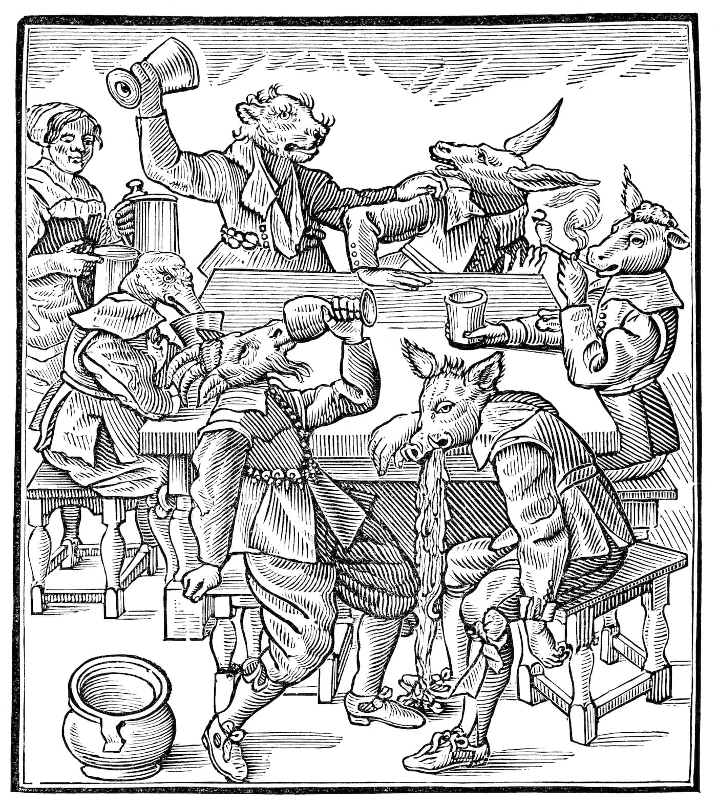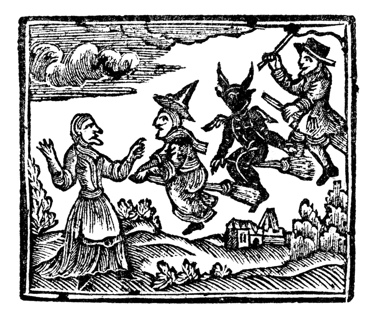 Graven Images highlights the oddities of the woodcut world, making for a fun, art historically grounded addition to a stack of coffee table books — it’s informative, but its emphasis is squarely on its images. Crabb makes plain from the start that this isn’t an academic study of early printed books; rather, it’s intended as an entertaining visual primer of some fantastic and sometimes downright creepy visions that have emerged from the human mind. He’s divided the book into six chapters based on subject: monsters and creatures (from Blemmyes to cryptids); satire (poking fun at religion, the economy, members of royalty); damnable practices (namely, witchcraft); drinking and drunkenness; murder and misfortune; and finally, “wanton women and gallants” — which features woodcuts of cross-dressing figures and brazen ladies who say things like, “Come out you bitch, I’ll maul you.”