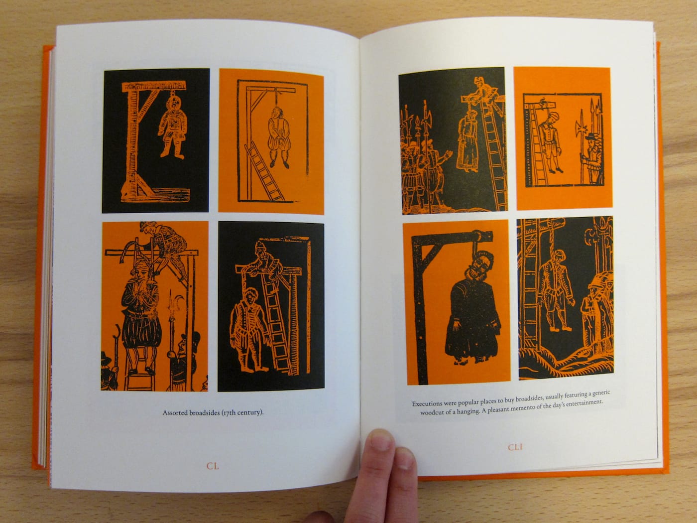 Although relatively light on text, the book features short descriptions by Crabb of particularly notable images and notes on visual trends to shed some light on why some of these woodcuts were made. Images of men barfing or drunkards getting visits from the devil, for instance, served to warn readers of the consequences of dousing oneself in alcohol. The literally sobering views of executions, meanwhile, were once part of collected memorabilia: they were printed in broadsides that people liked to purchase as a souvenir after witnessing a beheading.