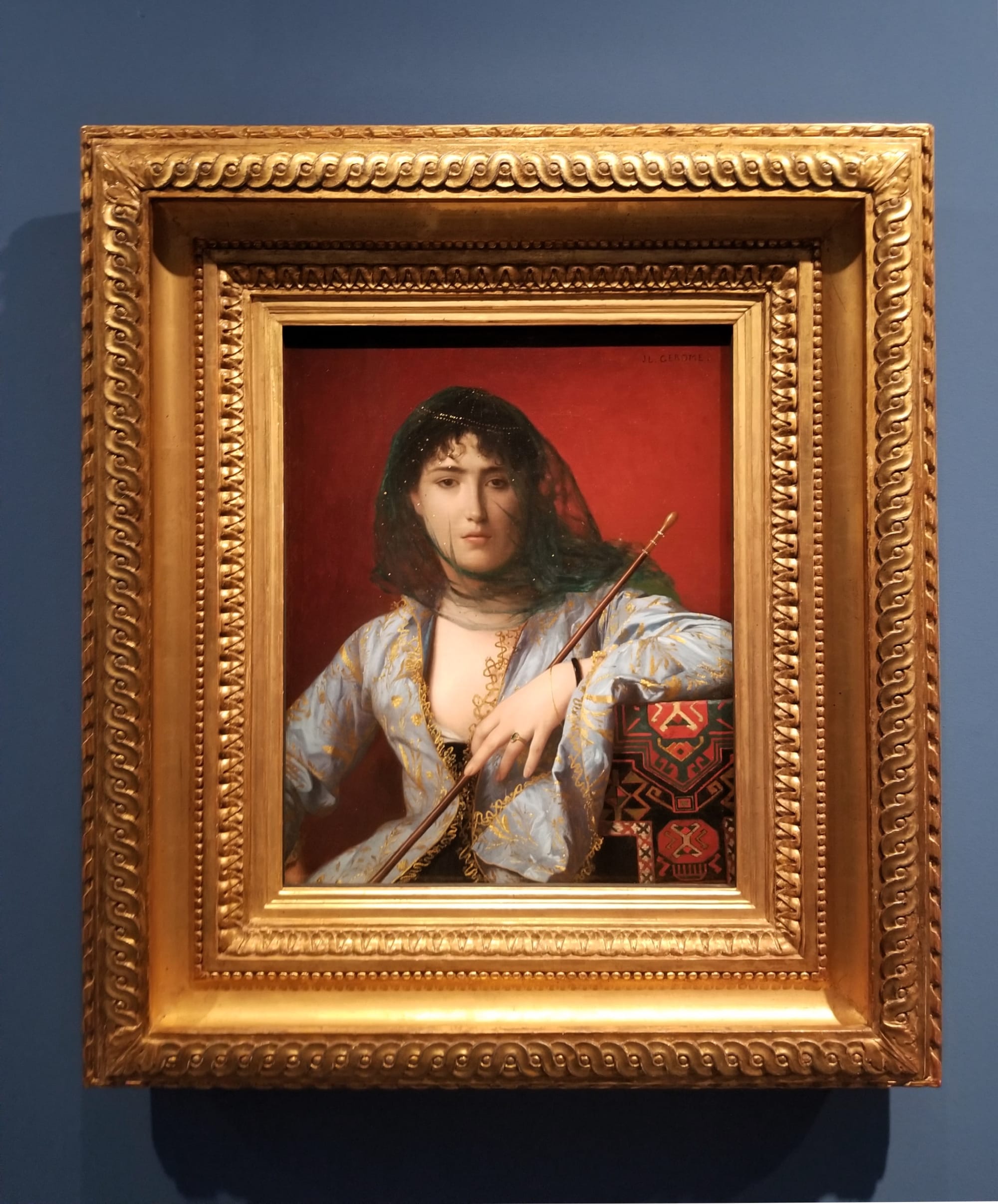 On cerulean walls and under warm, dim lights, the first section presents an unsophisticated definition via wall text: “The term ‘Orientalism’ describes how artists from outside the MENASA region… depicted its peoples, cultures, and landscapes, often blending reality with fantasy.” It’s a clever curatorial choice not to include works oversaturated with art historical opinion, such as Gérôme’s notorious “Snake Charmer” (c. 1879) or smutty paintings of enslaved North African people in paintings such as “The Slave Market” (1866). In this absence, we can focus on other works, such as the gracefully drawn portrait of the poker-faced “Veiled Circassian Lady” (1876) — depicted wearing Turkish fabrics and seated against Persian rugs — and see clearly that these also tell lies. Though Gérôme titled the painting after a Turkish ethnic group, implying that he met her on his travels, he in reality hired a fair-skinned model in Paris to pose for him, projecting his fantasies onto the canvas.
