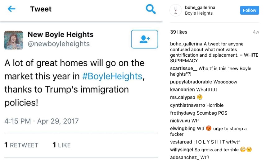 Gaines’s letter engages in a deeply troubling mystification of gentrification, a process he describes as one that, “hardly anyone understands.” What we have here is an epistemological conflict. Gaines and his peers’ notions of information and politics are being confronted by the knowledge and experience of Boyle Heights residents. People whose rent increased 300% understand gentrification. People who are called “nightmare tenants” understand gentrification. People who have been harassed and evicted by landlords, the police, and ICE understand gentrification. Gentrification is a well-studied, well-documented, and predictable process. Gentrification in its current form has been tearing up communities from New York City to New Orleans, from Detroit to Los Angeles. Thorough examples of writing on this process, specific to Boyle Heights, can be found in Magally Miranda and Kyle Lane-McKinley’s article on artwashing in a Blade of Grass and B.H.A.A.A.D.’s “The Short History of a Long Struggle.”