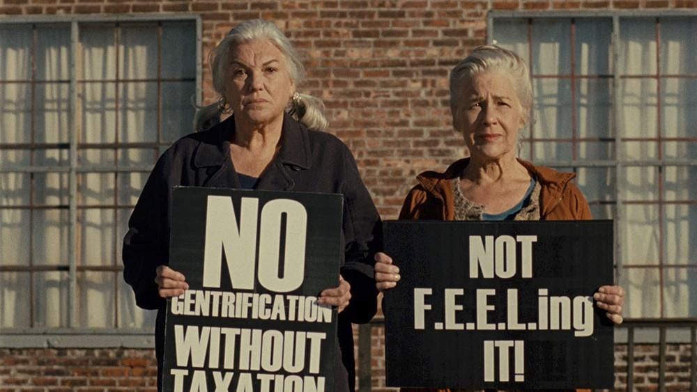 The Bread Factory is run by a lesbian couple, Dorothea (Tyne Daly) and Greta (Elisabeth Henry-Macari), who converted a former bread factory into a theater, film, poetry, and music space. Their daily operations are not overly romanticized, although at times there are flourishes of unpredictability and tempers flaring up. Some moments veer into absurd comedy, such as the couple’s dynamics with the young children who frequent the arts center. The centerpiece in “For the Sake of Gold” is a City Council meeting on the subject of the Bread Factory keeping its grant. In these sequences, Wang portrays the inseparability of art and political activism for the Bread Factory’s two founders.
