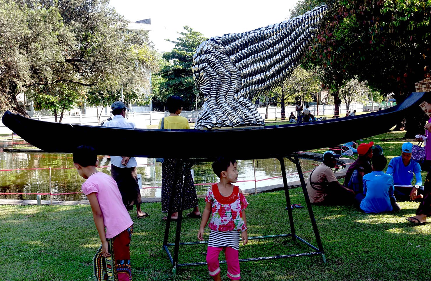 Sculptures were installed in Thakin Mya Park for the festival, including a powerful one dedicated to the idea of individual liberty. Made by Htay and his curatorial team and titled “Wing of Hope,” it featured the arc of a sculpted metal wing placed inside a raised canoe — the former indicating motion through the air, the other motion though the water, symbolic of the aspirations of free ideas and spirits. Its label said it was “represented to the whole public who were hoping to gain freedom to live under the long era of dictatorship.”