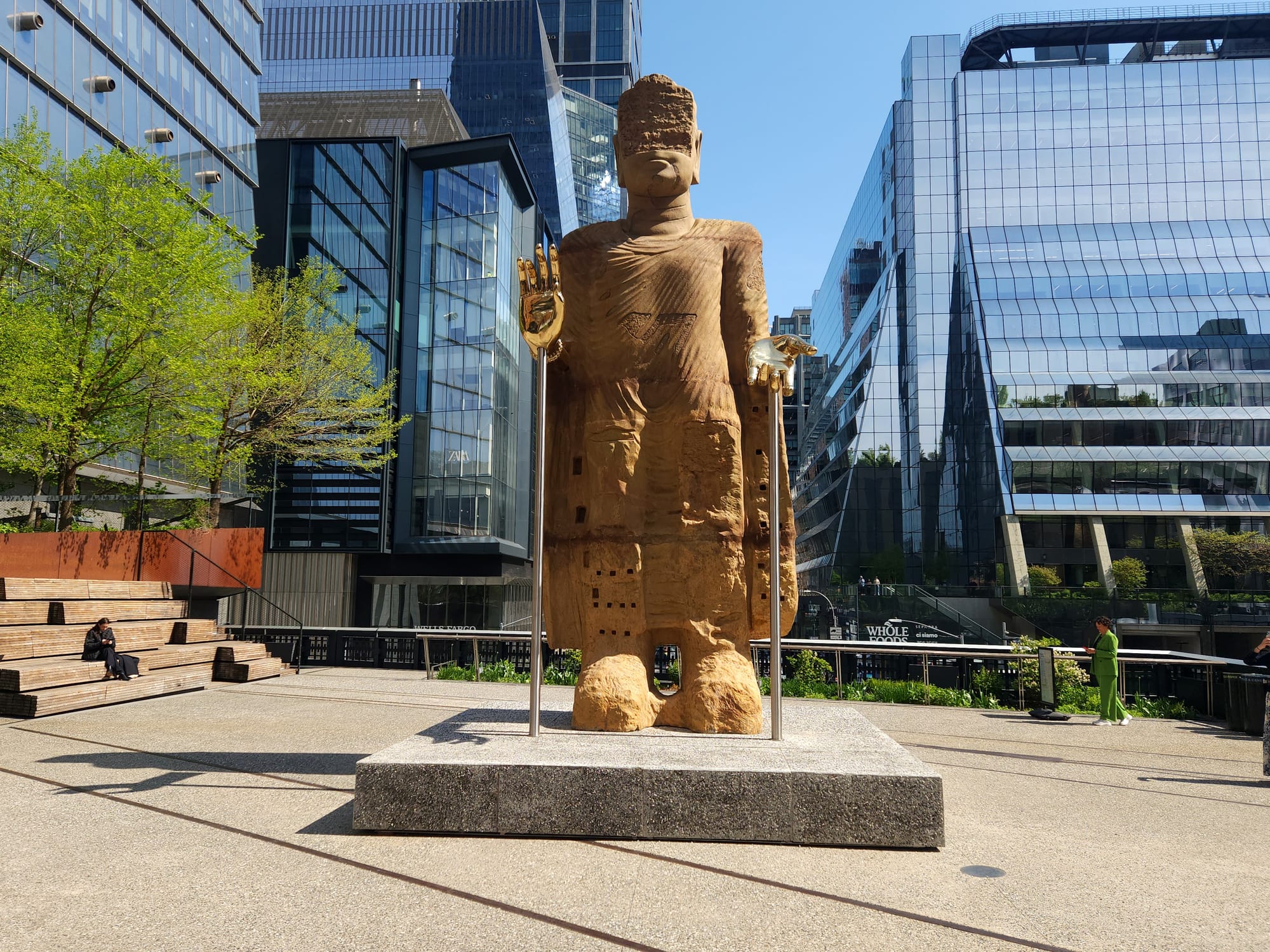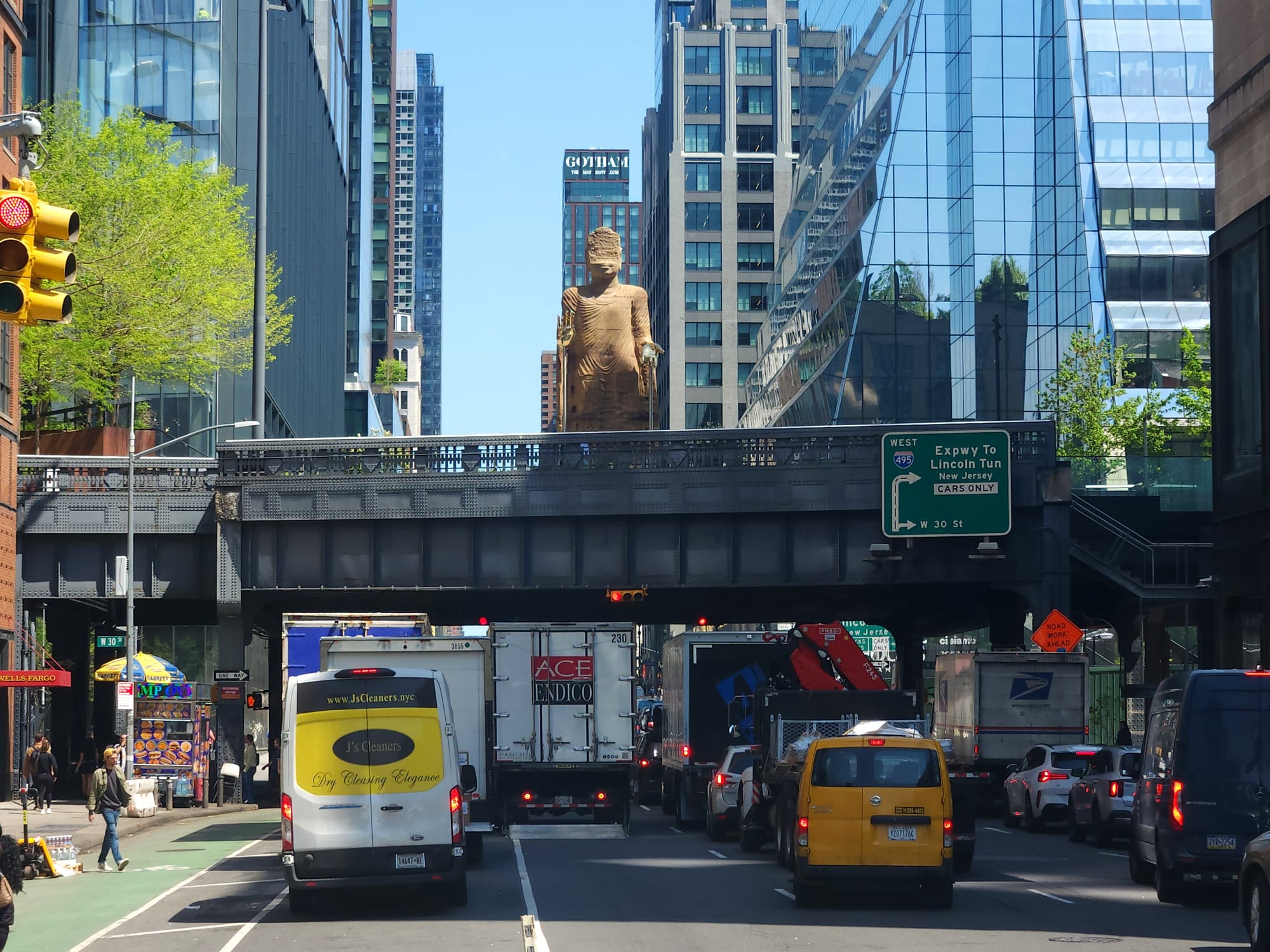 Between the sea of sky-blue high-rise windows and the traffic funneling toward the Lincoln Tunnel, a large sandstone Buddha stands tall on the High Line, inviting Manhattan to embrace a moment of tranquility.