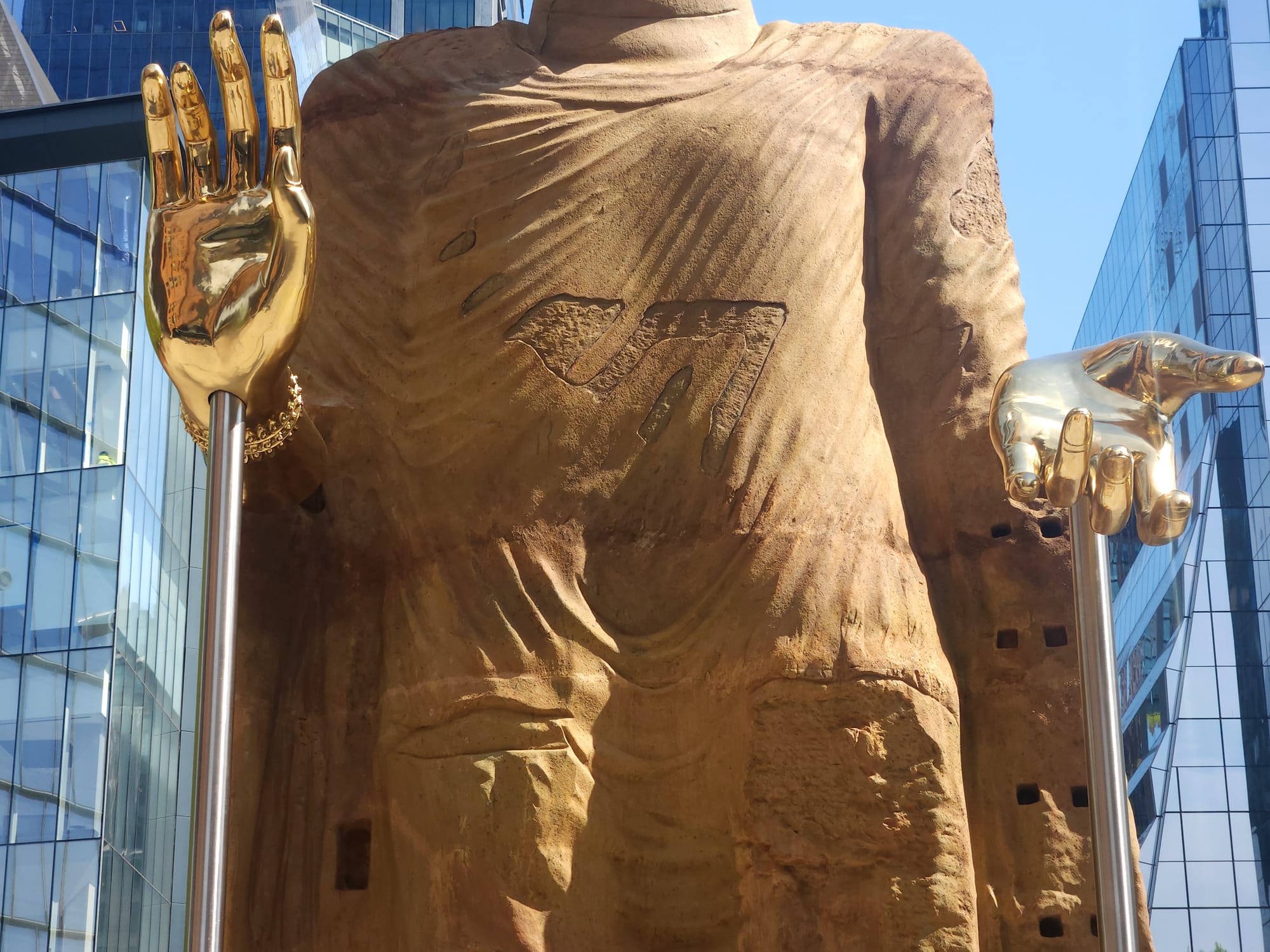 Tuan Andrew Nguyen’s sandstone and brass take on the destroyed Bamiyan Buddhas reminds passersby that history repeats.