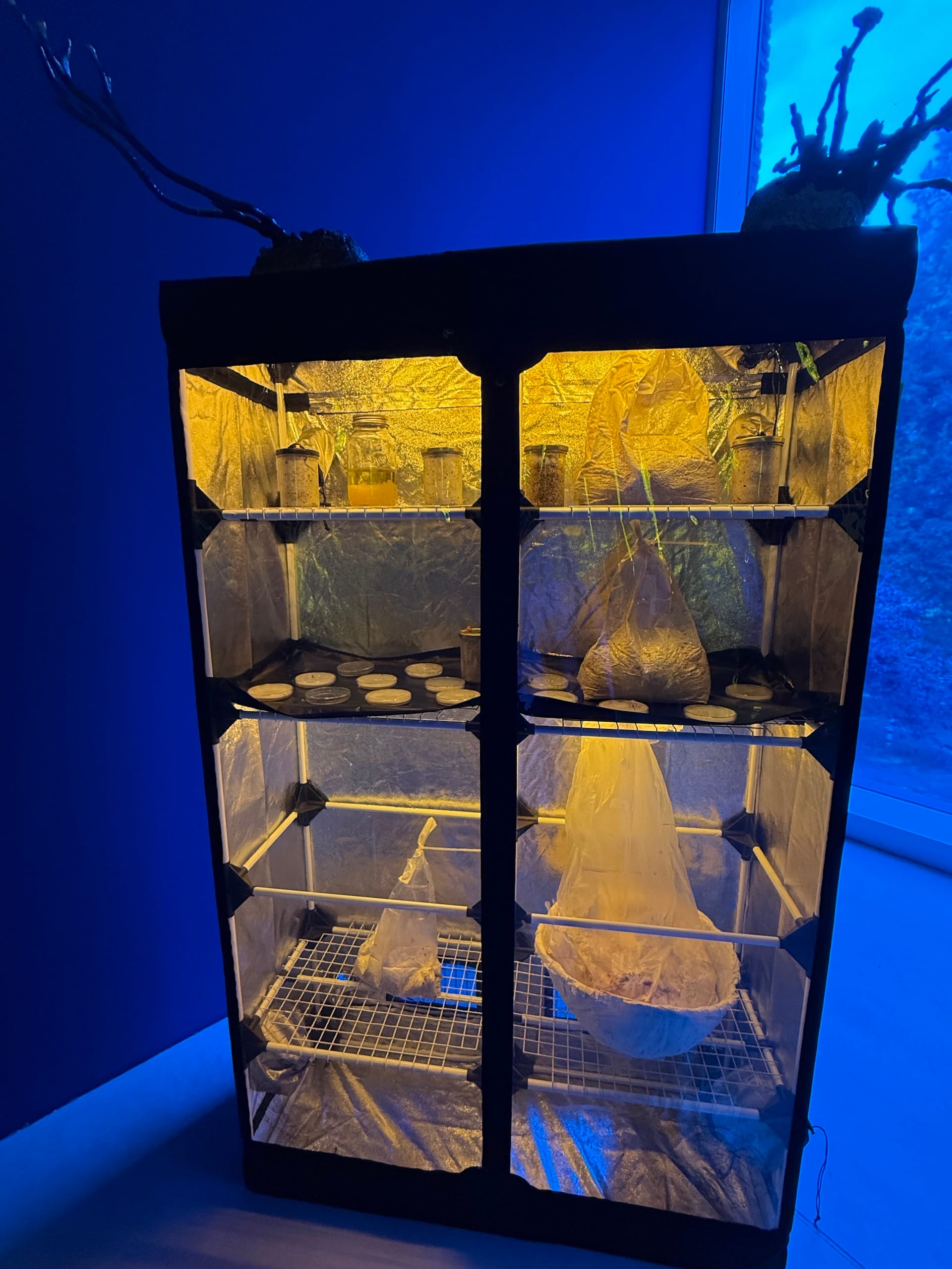 Under colonialism, botany has been used as a tool of empire to assault biodiversity and Afro-Indigenous lifeways. “San Nou,” an eco-installation by Aurélie Derard and Mawongany with Mycelionaires, serves as a gesture of restoration. Jars, petri dishes, and bundles of organic matter sit within a glass cabinet that glows in the gallery corner like a luminous altar. It is a greenhouse-cum-laboratory designed to activate mycelium. Mycelium begins as spores — echoing the institution’s own name — before developing into a network of threads when given the right balance of moisture, oxygen, nutrients, and warmth. This fungus carries philosophical weight as a symbol for decentralized networks, grassroots activism, solidarity, and mutual support. Fungi are also regenerative, capable of breaking down toxins and restoring damaged ecosystems — an ecological parallel to decolonial and climate justice visions. Interpreted idiomatically as “our own” in Martinican Creole, “San Nou” also references the African diasporic tradition of bain démarré, ritual herbal baths that cleanse, protect, and reset. Both mycelium and bain démarré thus become metaphors for purging harm and regenerating life.